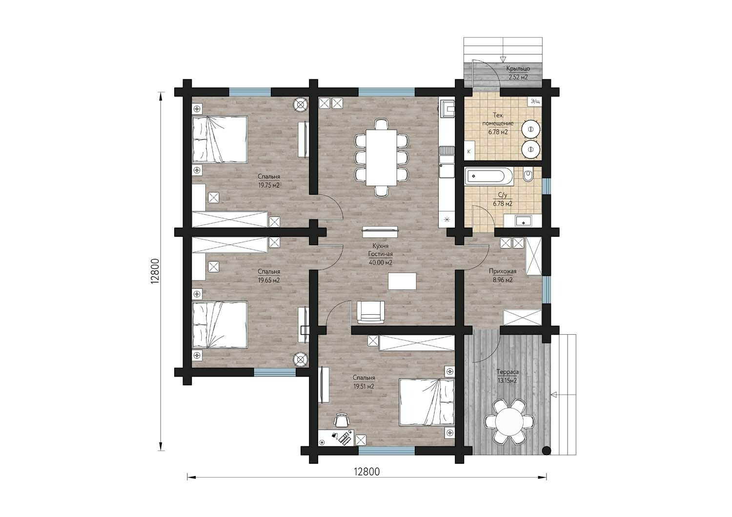 Дом имеет кухню-гостиную, 3 спальных комнаты, санузел, тех. помещение, прихожую, крыльцо и террасу.