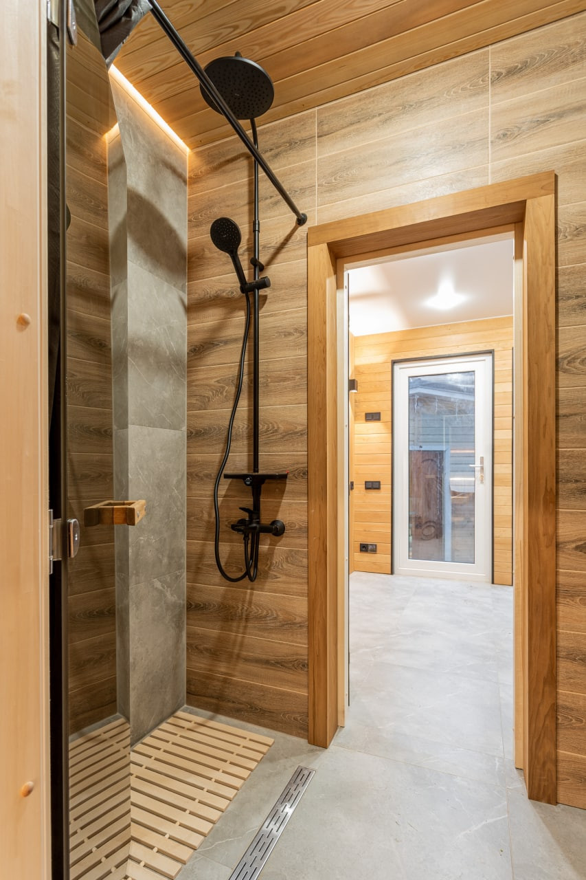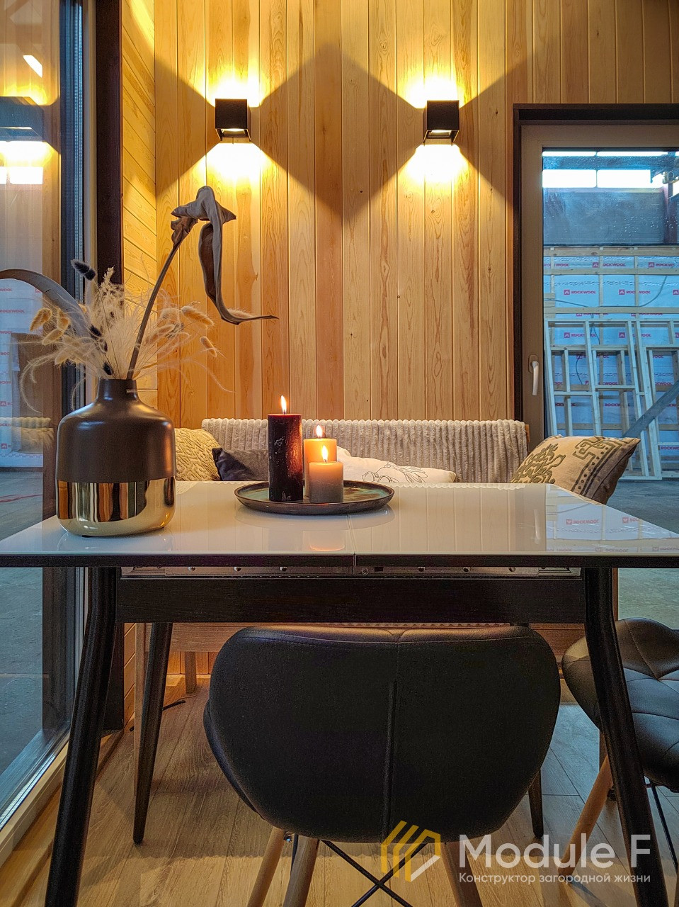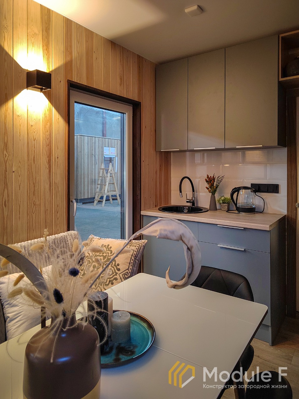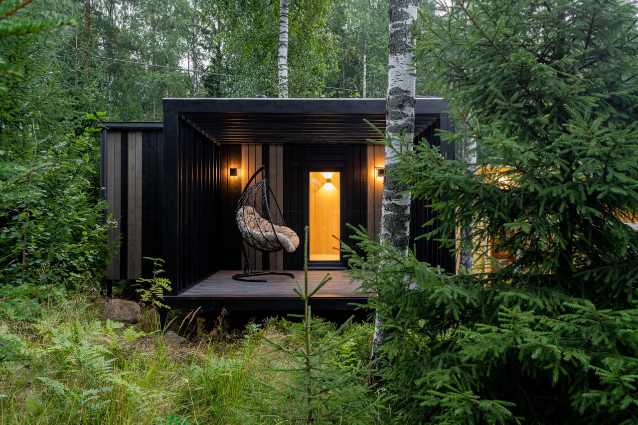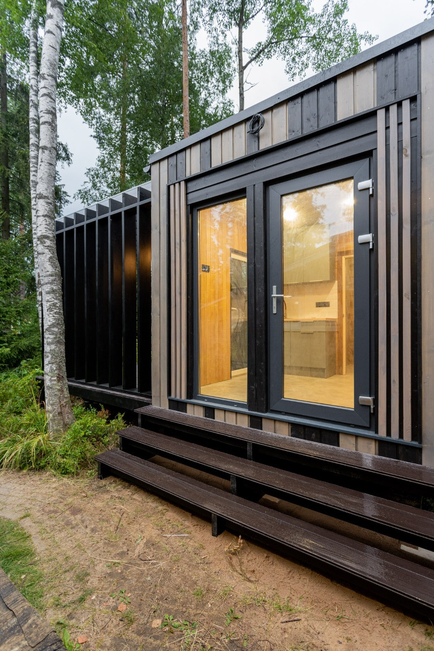 Современный модульный дом для круглогодичного проживания. С полной чистовой отделкой, оборудован сантехникой, душевой, все в стиле "Лофт". Очень комфортабельный и теплый. Высота потолков 2,8м. Окна в пол.