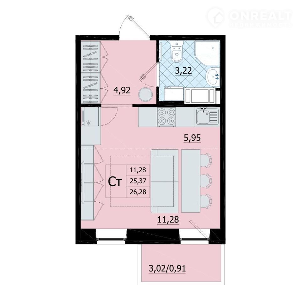 Общая площадь 26.3 м2