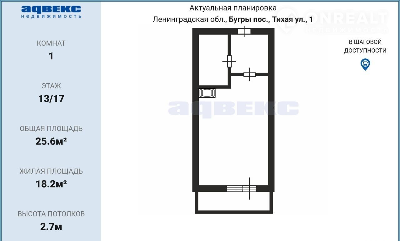 Квартира студия, 25.6 м2, этаж 13 / 17, на продажу в поселке Бугры, Тихая улица, 1