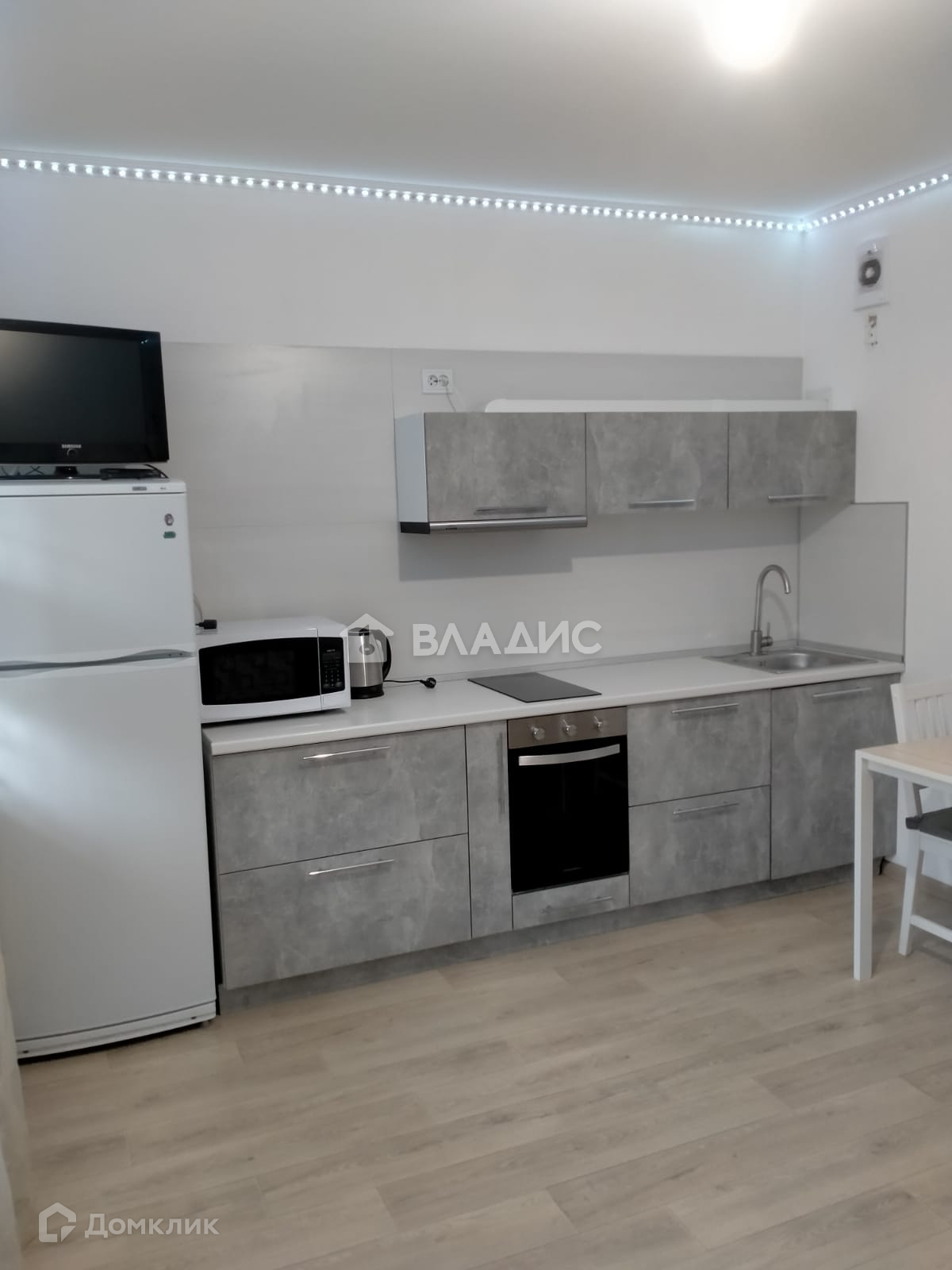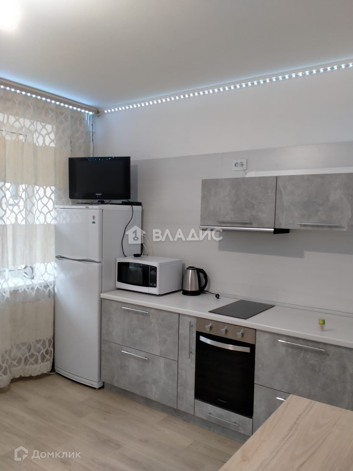 : варочная панель, духовка, холодильник, телевизор, микроволновка, чайник и стиральная машина;