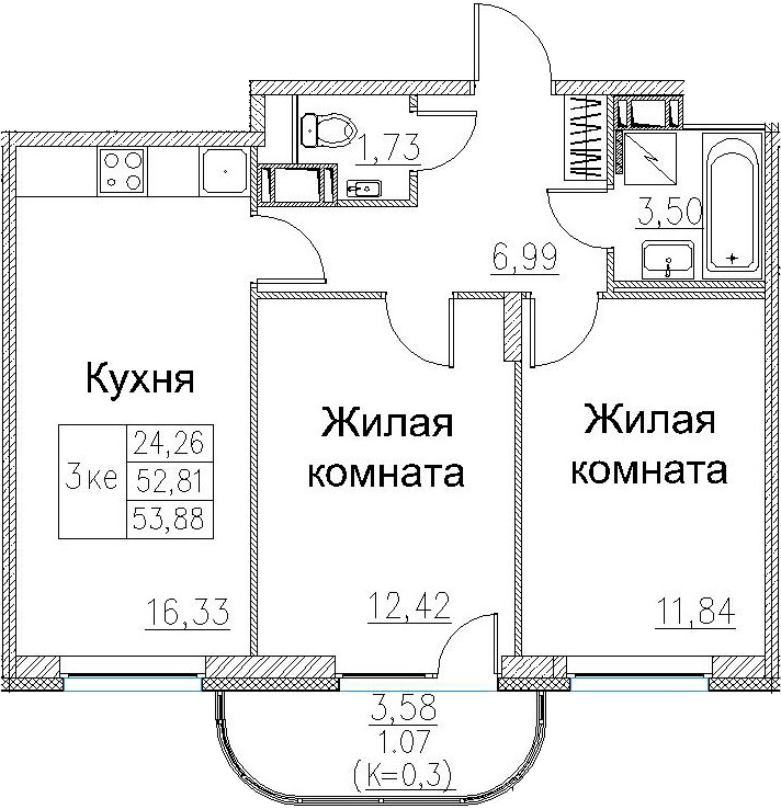 Общая площадь 53.88 м2