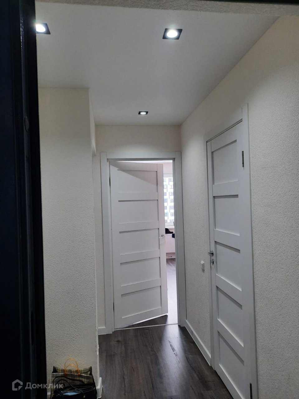 В коридоре натяжной потолок. Пол ламинат.