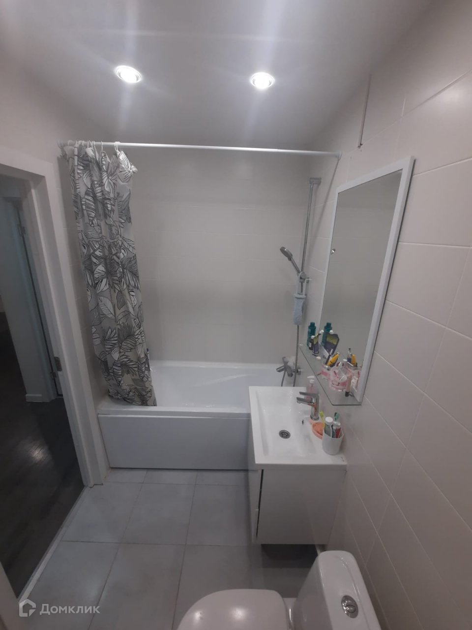 Ванна выложена плиткой + натяжной потолок.