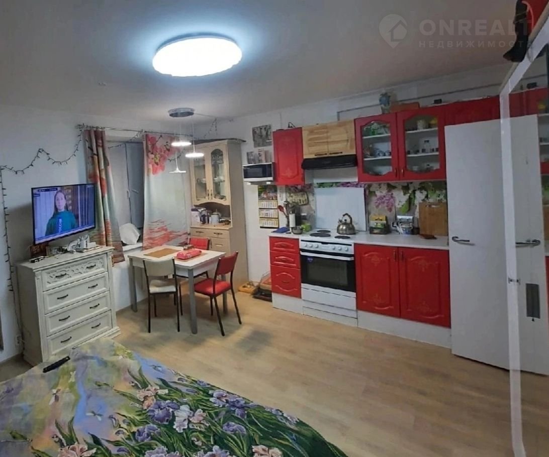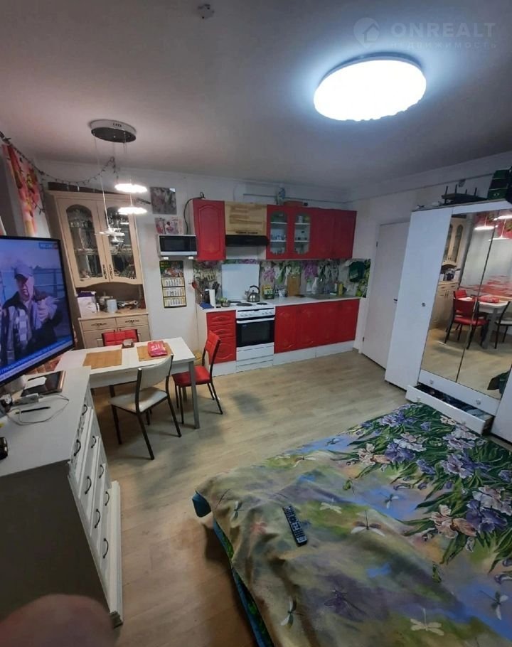 Студия располагает большой комнатой, которая благодаря продуманному зонированию может выполнять одновременно функцию спальни, кухни и гостиной. Уютная квартира для проживания одного или двух человек или молодой семьи с ребёнком .