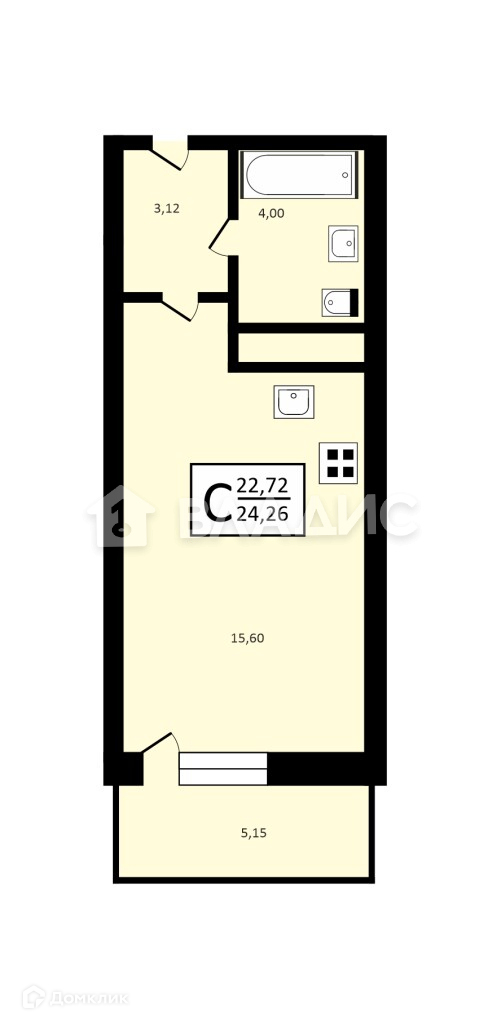 Общая площадь 22.8 м2