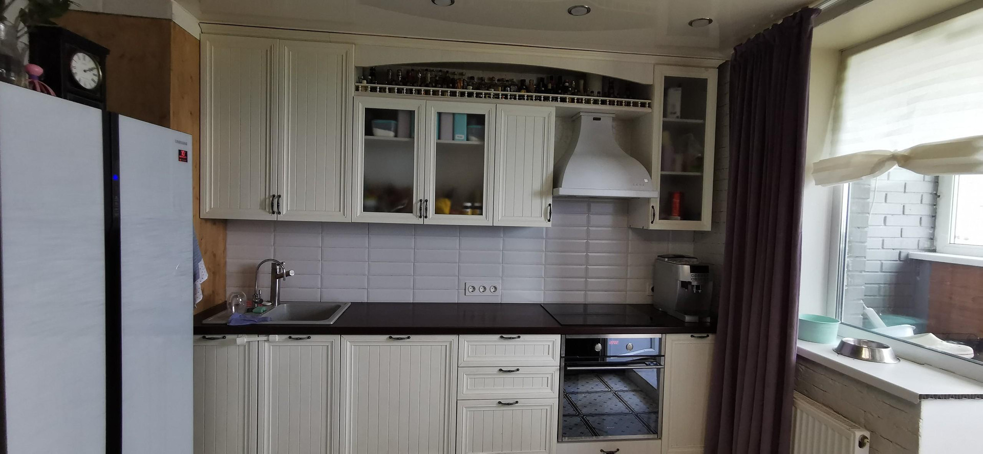 В большой кухне - гостиной новым хозяевам останется кухонный гарнитур со всей встроенной техникой (широкая (60см) посудомоечная машина фирмы Bosch, варочная панель фирмы Hotpoint Ariston, духовой шкаф фирмы Hansa и т.д.) сервант выполненный в одном стиле с кухонным гарнитурой, холодильник LG, шкаф для хранения посуды (ЗЫ: можно рассмотреть возможность оставить остальную мебель). Установлен натяжной потолок.