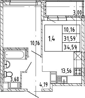 Комфортная планировка: Кухня (13,56 м2) с выходом на большую застекленную лоджию (3 м2), комната (10,16 м2), совмещенный санузел с ванной (3,68 м2).