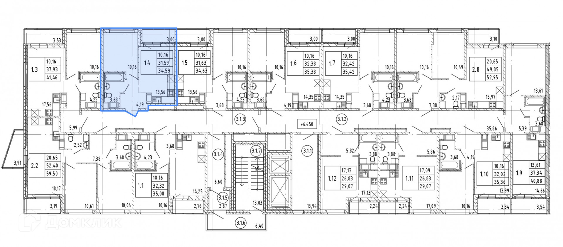 Общая площадь 34.59 м2
