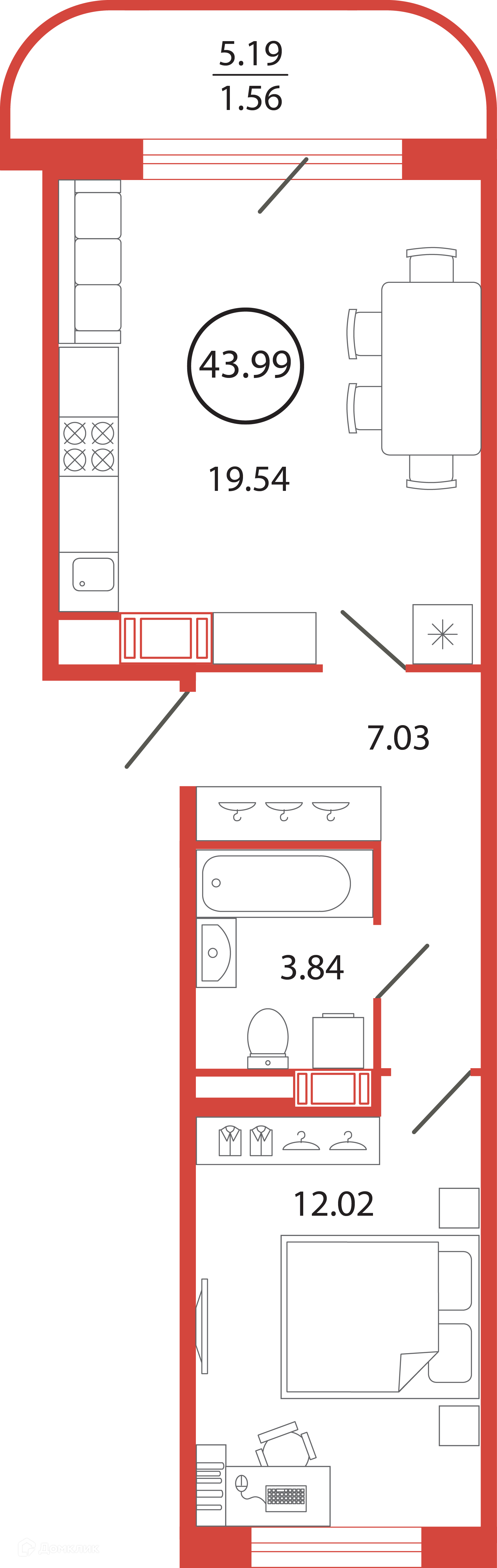 Общая площадь 43.99 м2