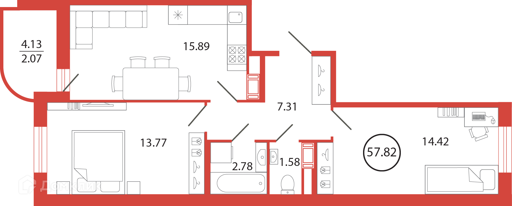 Общая площадь 57.82 м2
