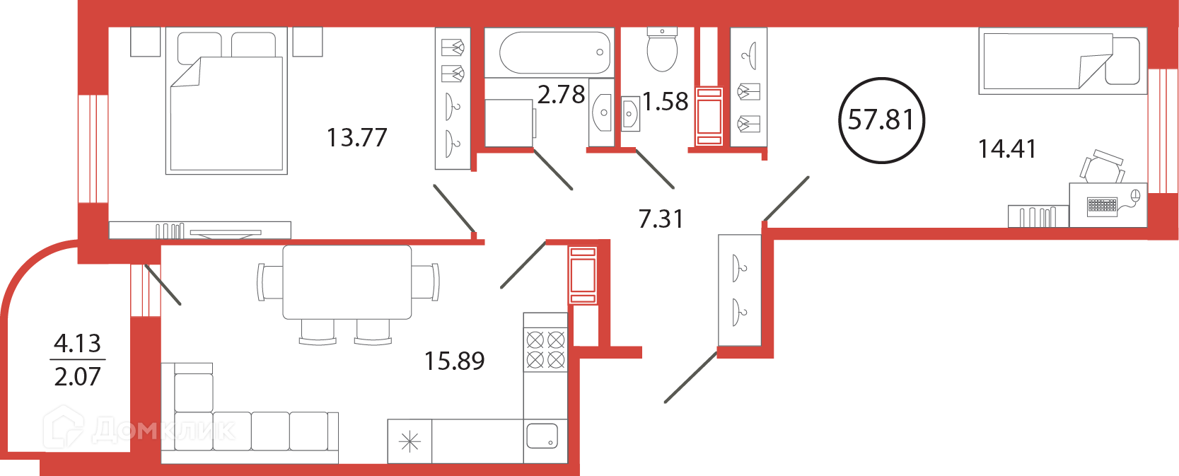 Общая площадь 57.81 м2