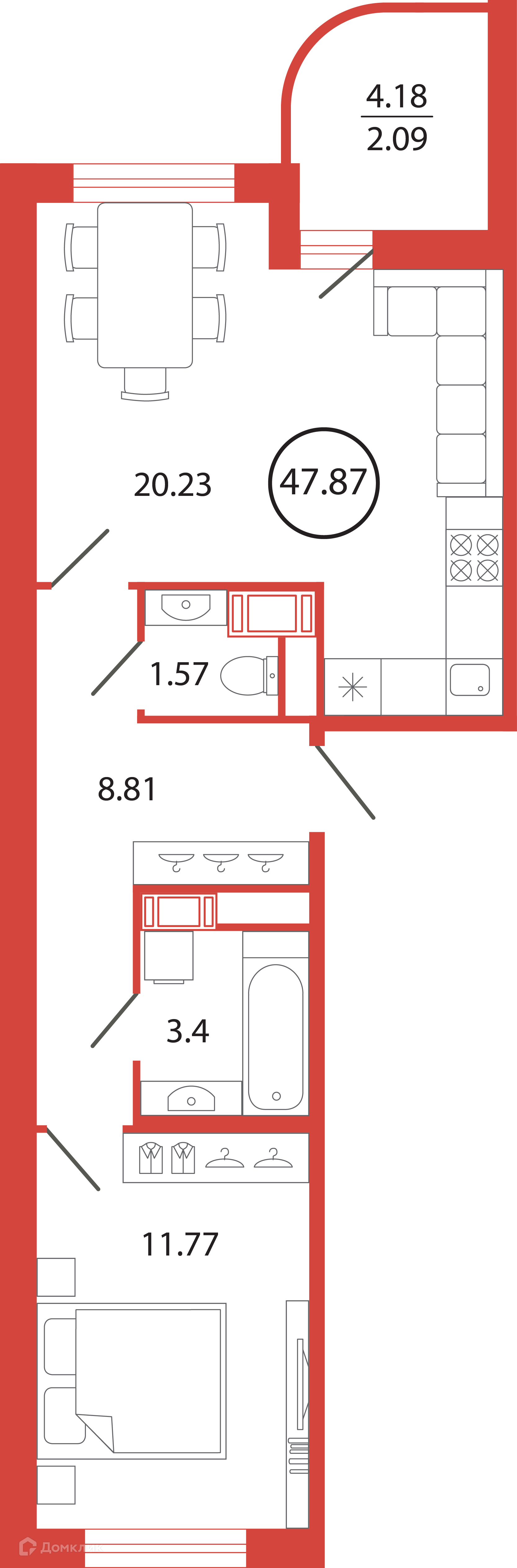 Общая площадь 47.87 м2