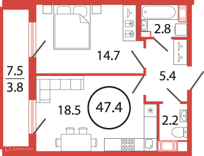 Общая площадь 47.4 м2