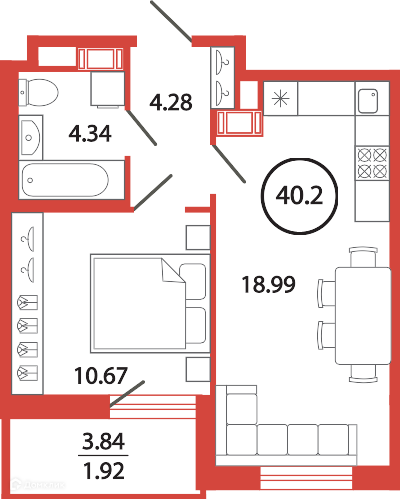 Общая площадь 40.2 м2