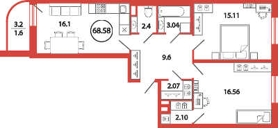 Общая площадь 68.58 м2