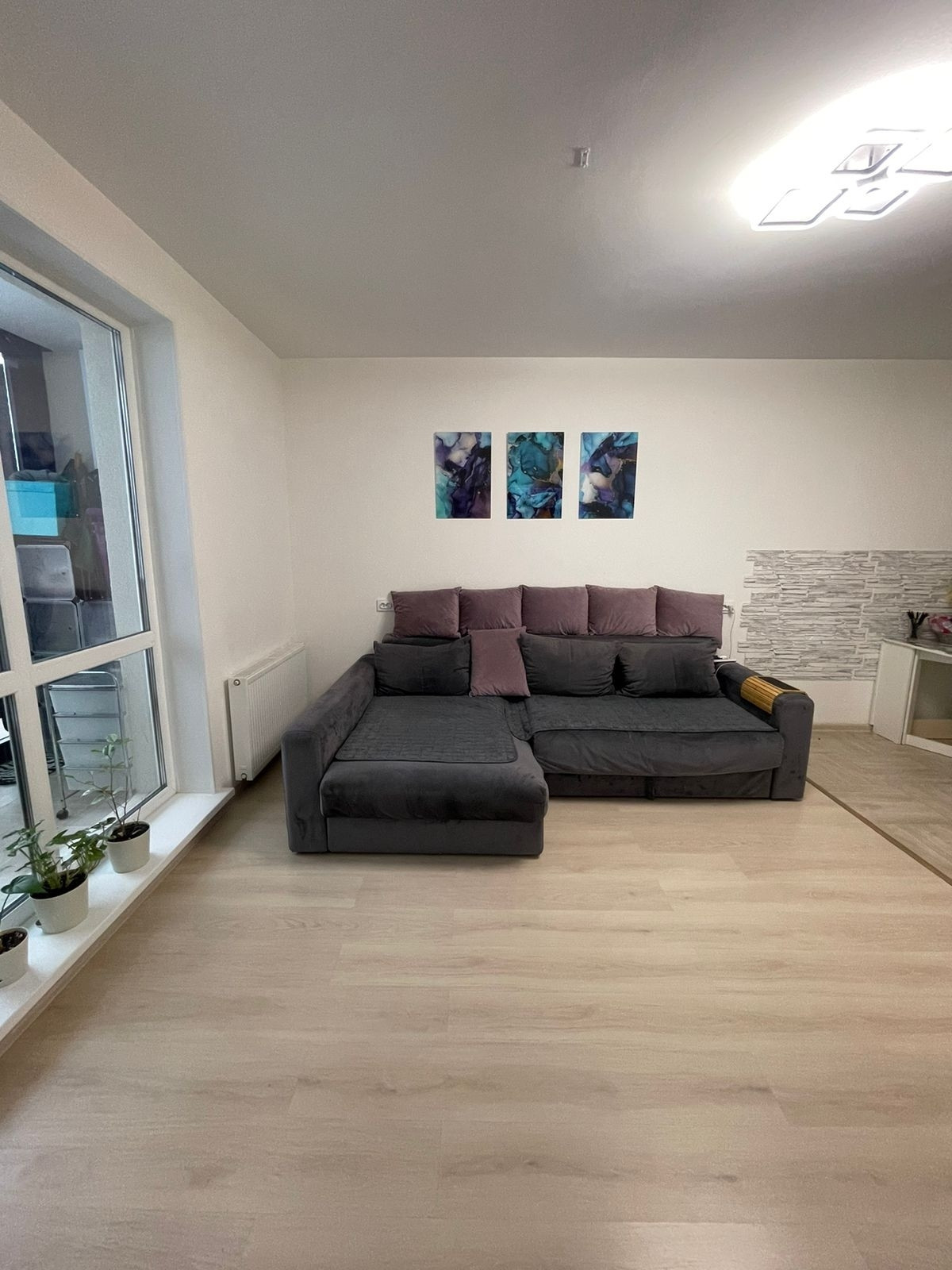 комната- квадратной формы 15, кв. м; Очень светлая за счёт увеличенных оконных проёмов.