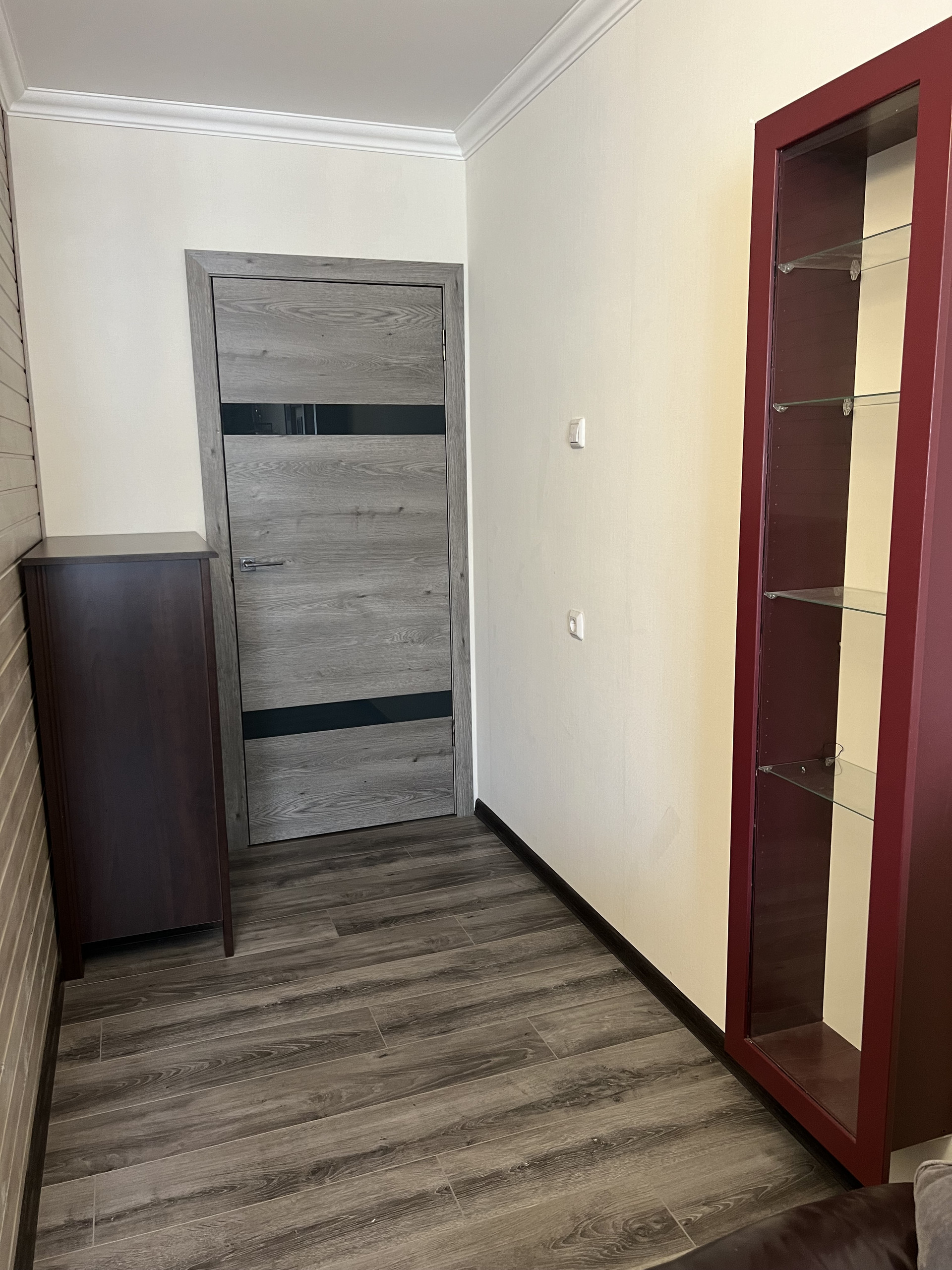 Окна комнат выходят на разные стороны. В одной из комнат оборудована небольшая гардеробная, из другой выход на застекленную и утепленную лоджию. В прихожей вместительный шкаф-купе.