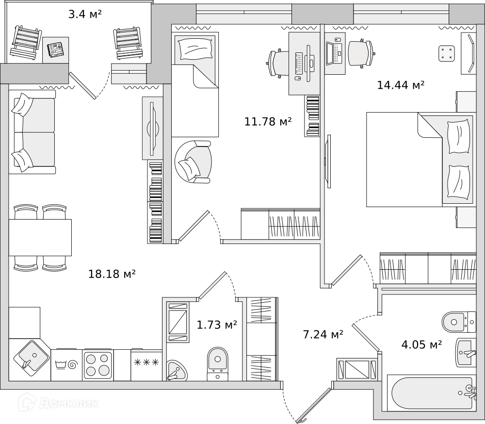 Общая площадь 57 м2
