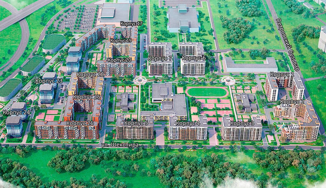 - В состав жилого комплекса входят школа с углубленным изучением английского языка и два детских сада