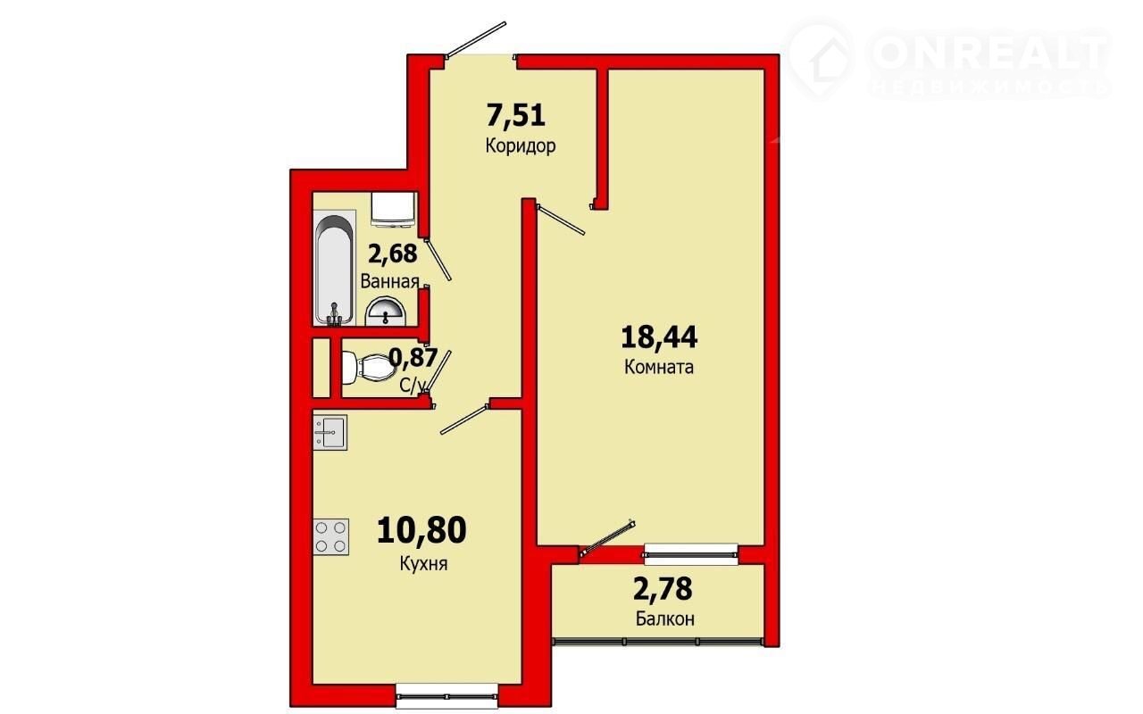 - площадь квартиры 40,1 м2. Комната 18,4, кухня 10,8 м