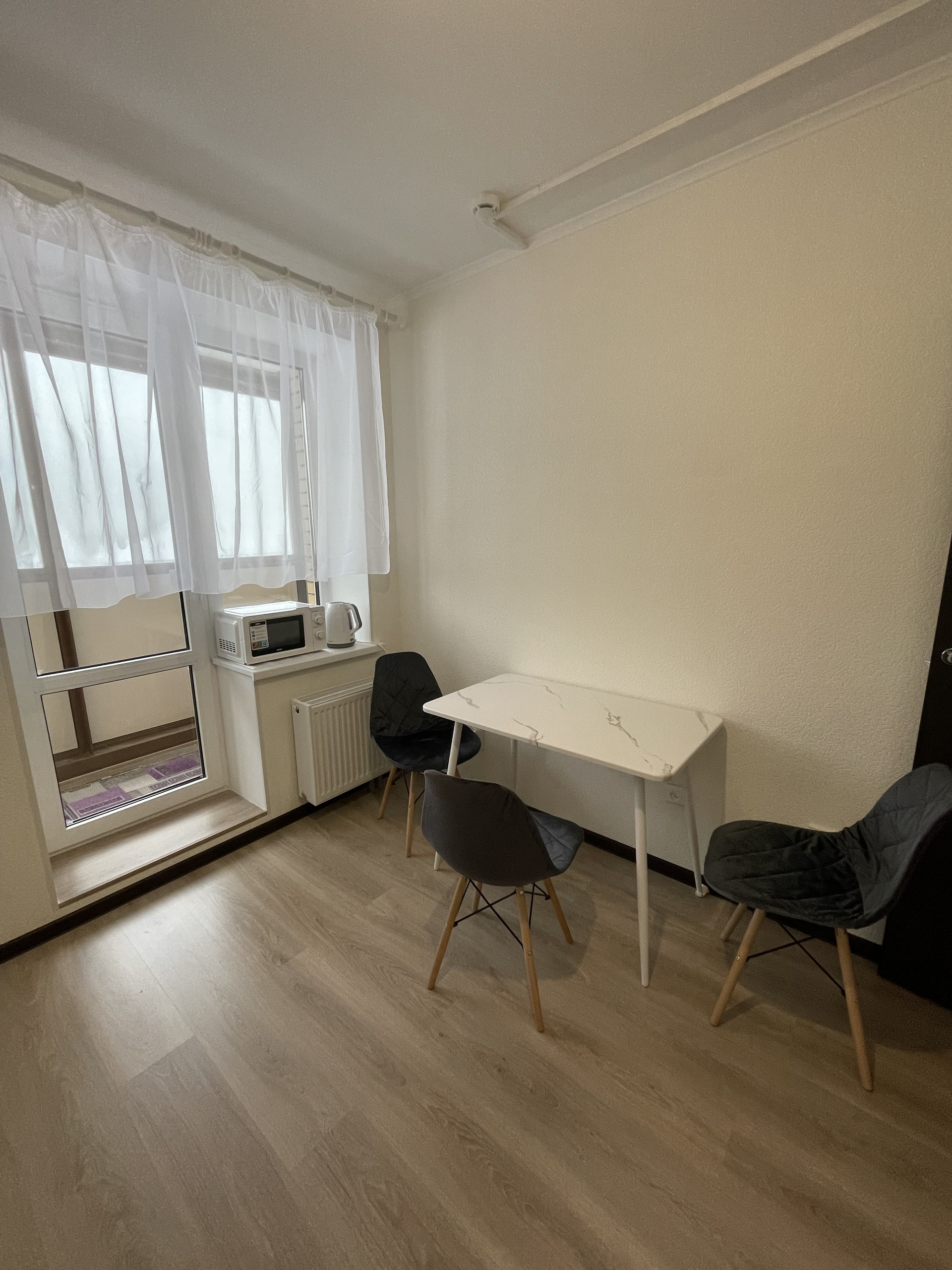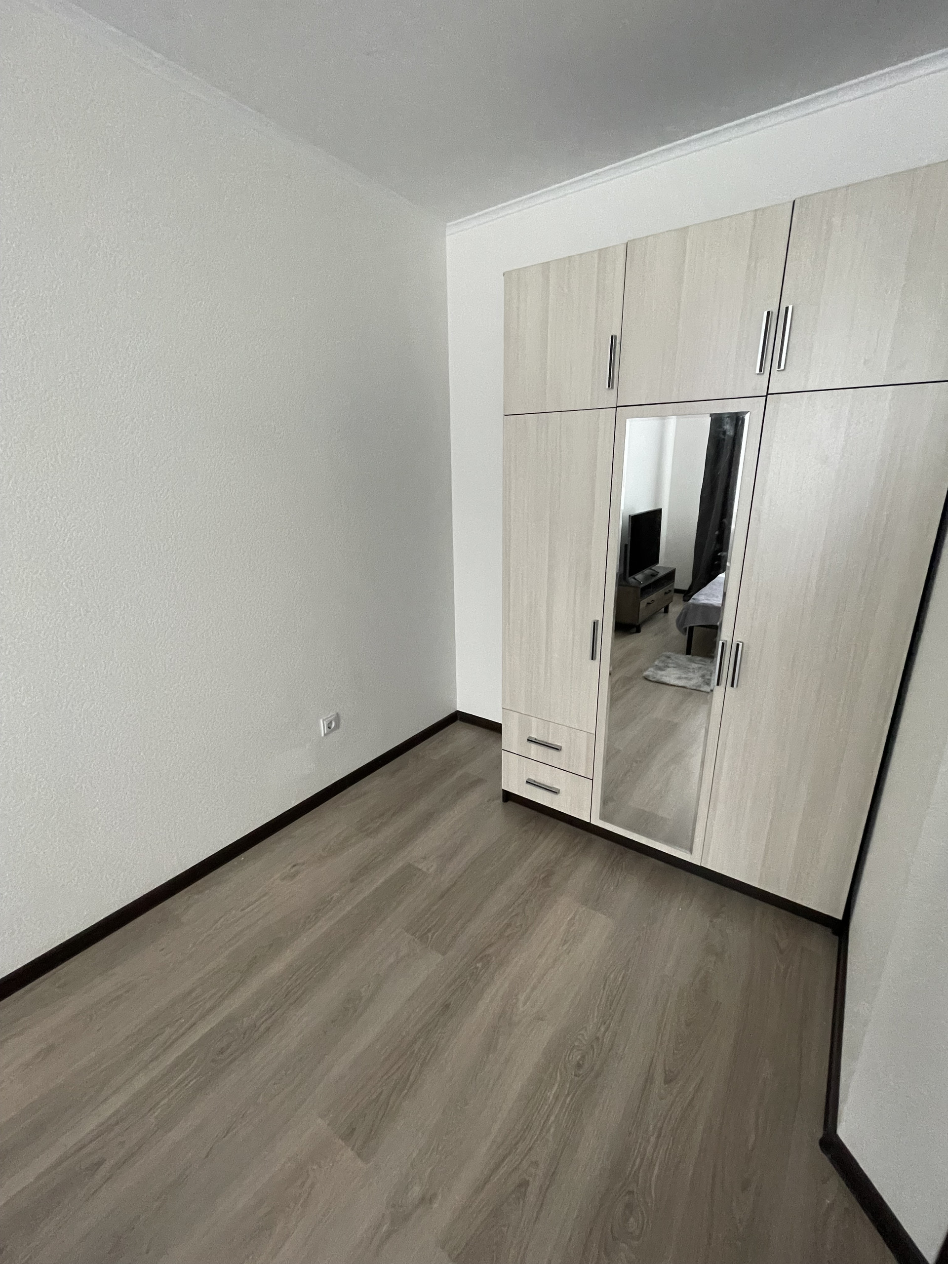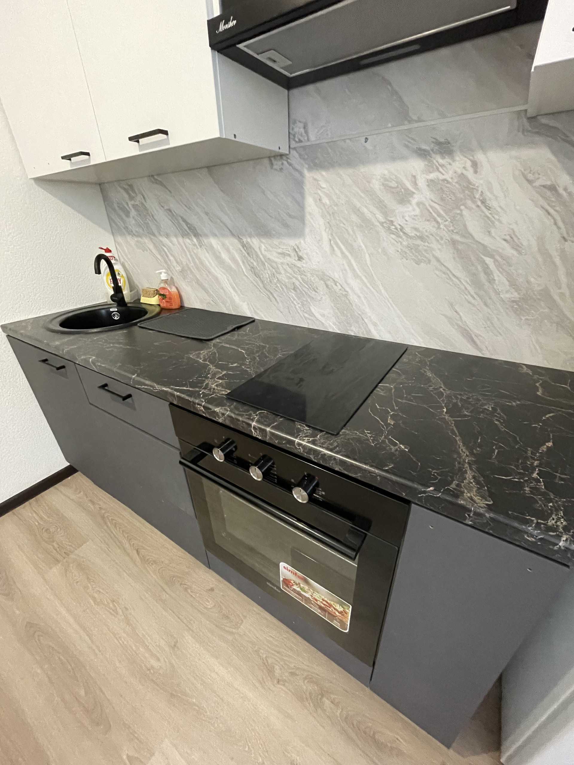 На кухне пока отсутствует дверца шкафчика где вытяжка и несколько фасадных ручек, будут установлены в течение недели.