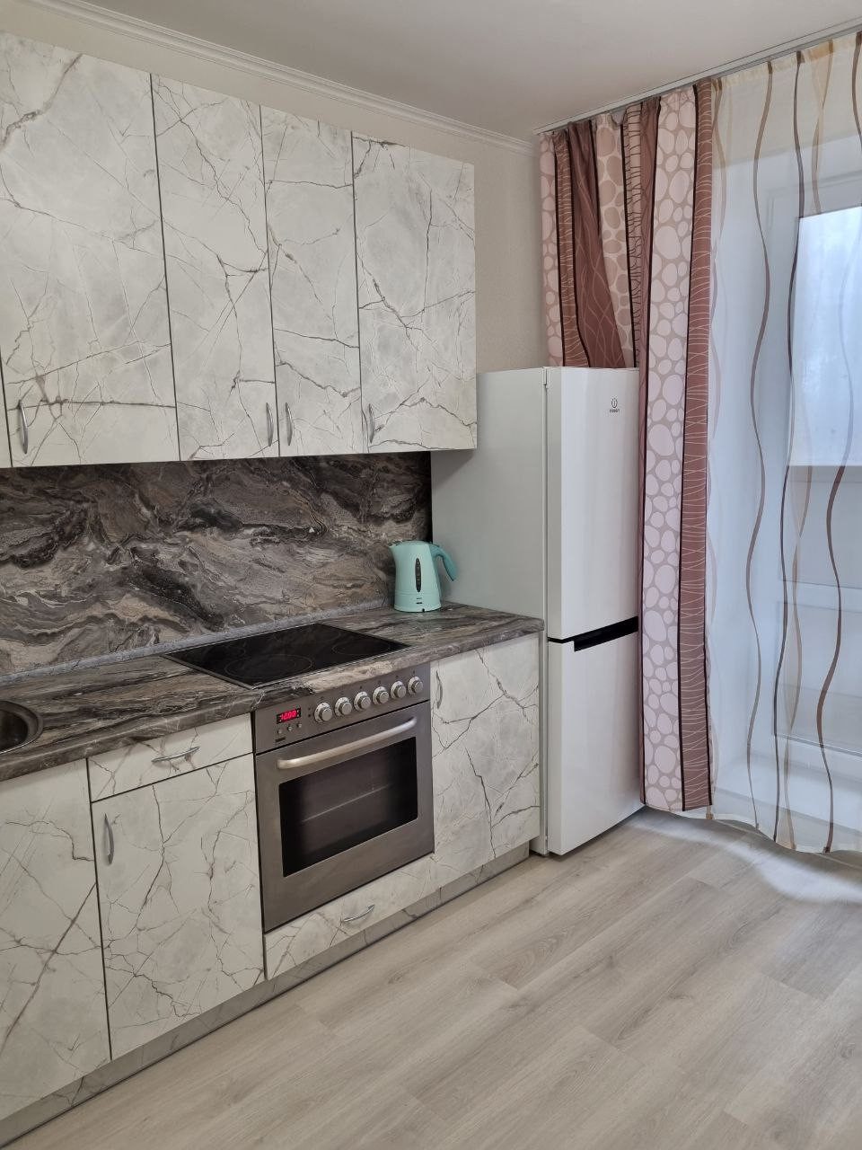 Для комфортного проживания в квартире есть всё: Кухонный гарнитур, варачная панель, электрический чайник, кухонная посуда, холодильник INDESIT, обеденный стол, 2 стула.