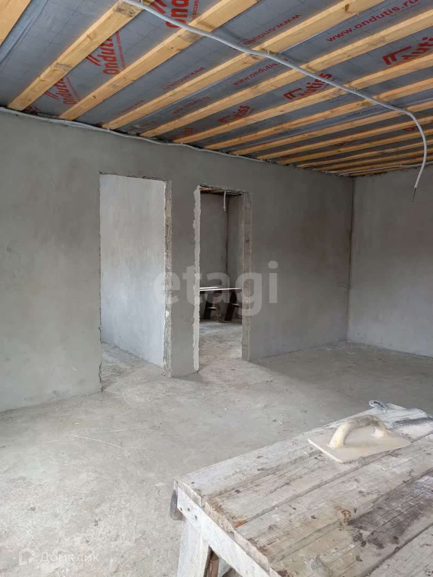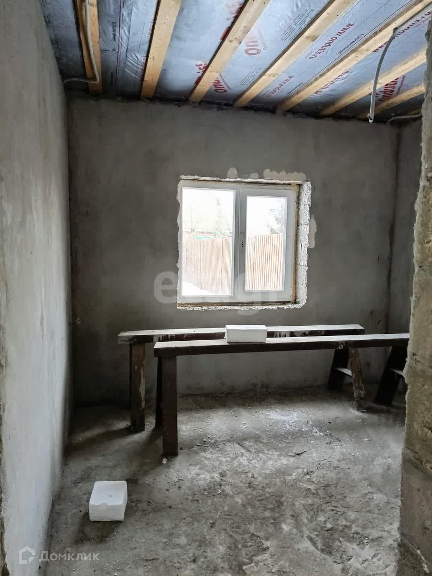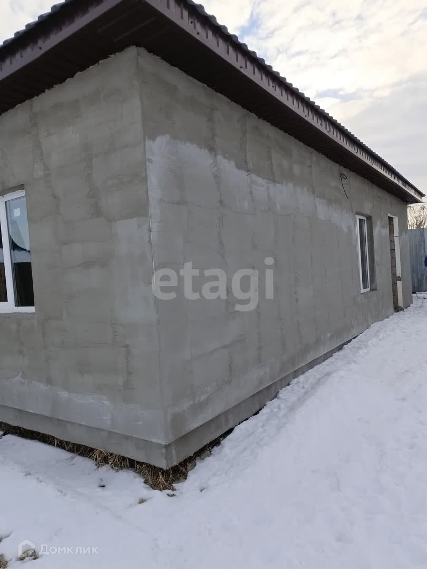 Дом 53 кв.м на участке 4 сотки из усиленных керамзитобетонных блоков размером 300*400*200. Фасад дома утеплен пенопластом, оштукатурен с применением фасадной сетки, подготовлен под дальнейшее чистовое покрытие. Стены внутри тоже оштукатурены и подготовлены к чистовой отделке. Крыша - металлочерепица.