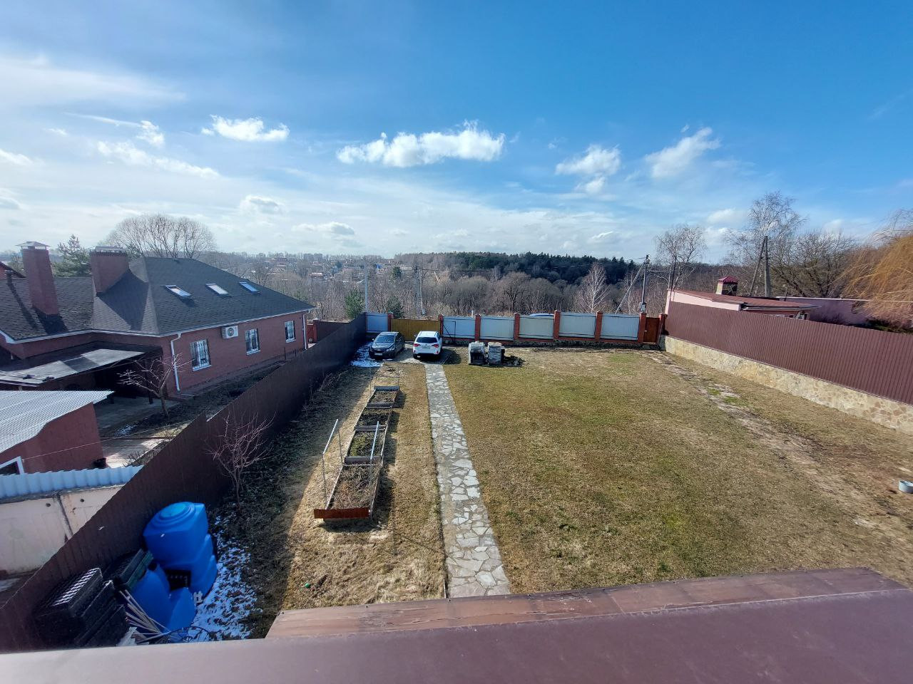 Участок – 9 соток, правильной формы, огорожен капитальным забором (ж/б столбы) с откатными воротами. Дом вписан в участок таким образом, что 70% земли свободны и могут быть застроены или использованы под сад. Окна выходят на западную сторону, участок полностью освещается солнцем. Парковочное место на 2 автомобиля. Участок с небольшим уклоном – проблем с водоотведением нет. Асфальтированный освещенный подъезд, приписанный к трассе М2 (ремонтируют, зимой чистят).
