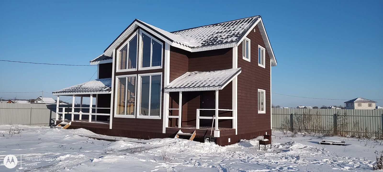 Второй свет, фасад- фиброцемент. Крыша - металлочерепица. Забор - профлист.