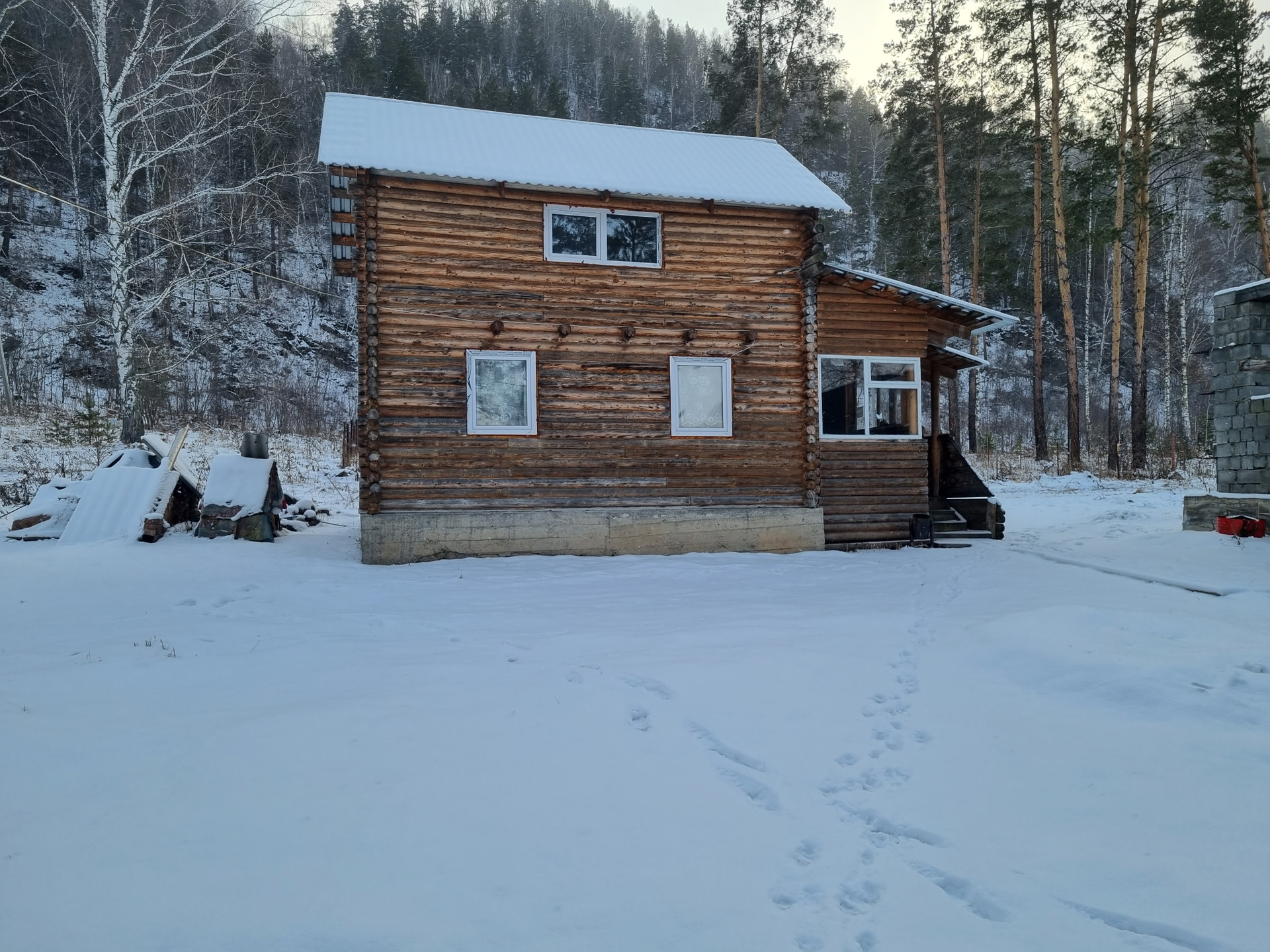 Дом построен из оцилиндрованного бревна, установлены пластиковые окна