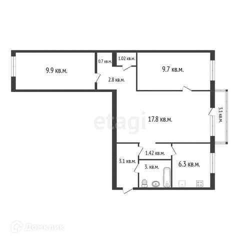 Общая площадь квартиры без учёта балкона - 55.6 кв.м. + остеклённый балкон - 3.1 кв.м.