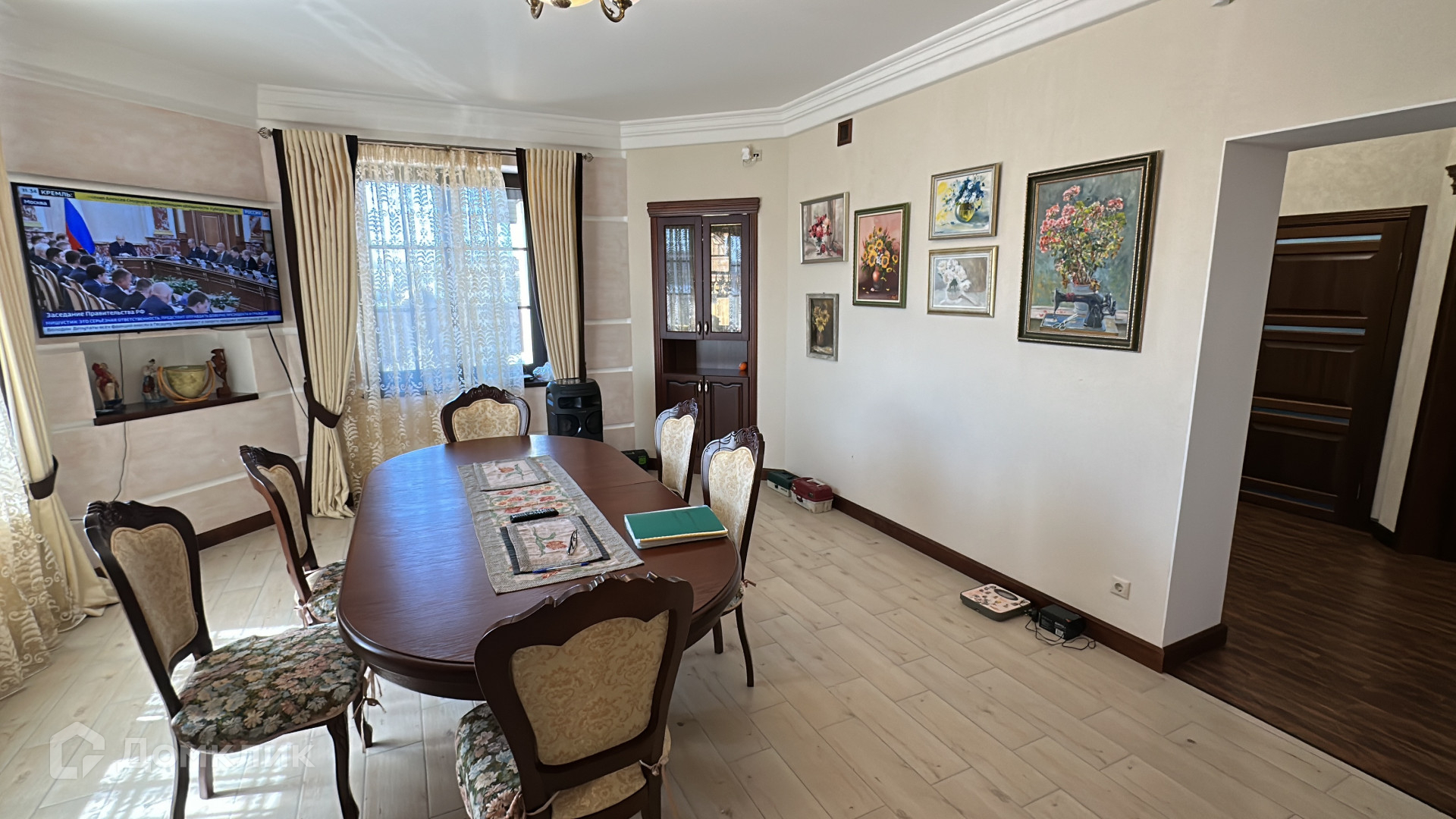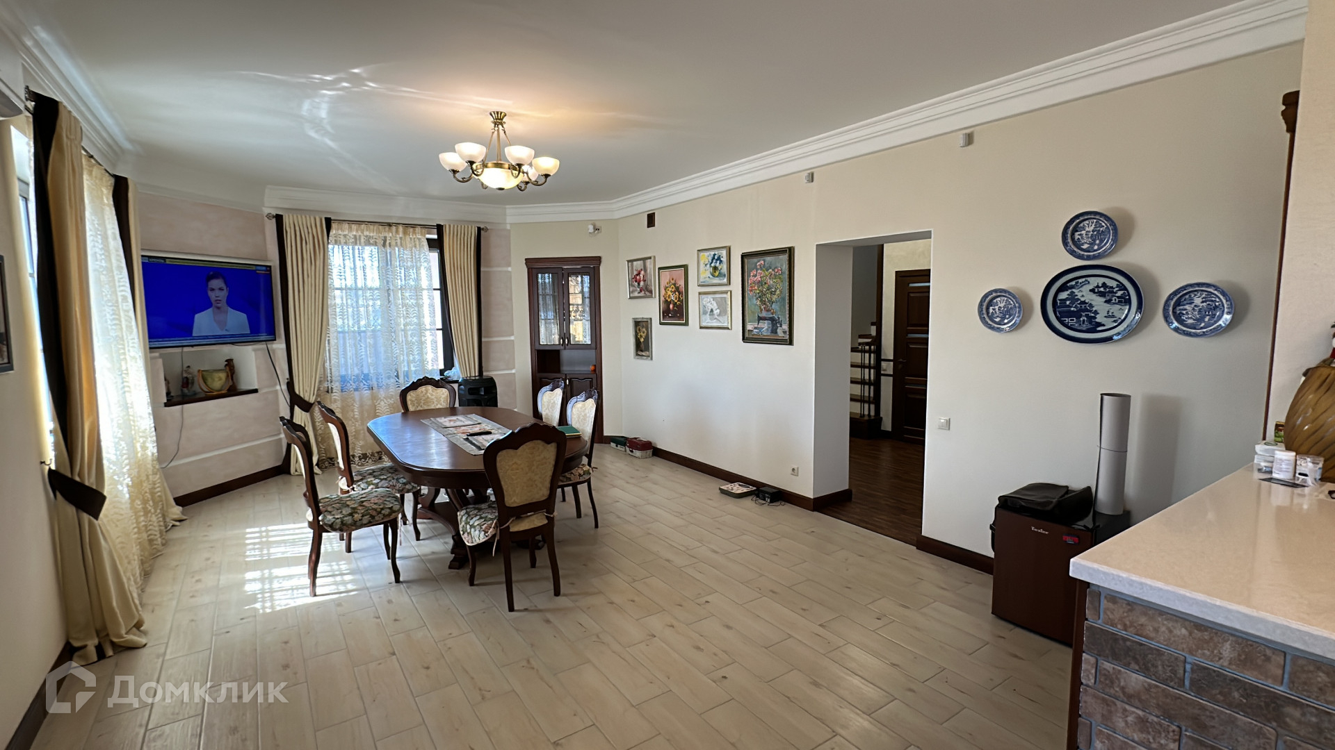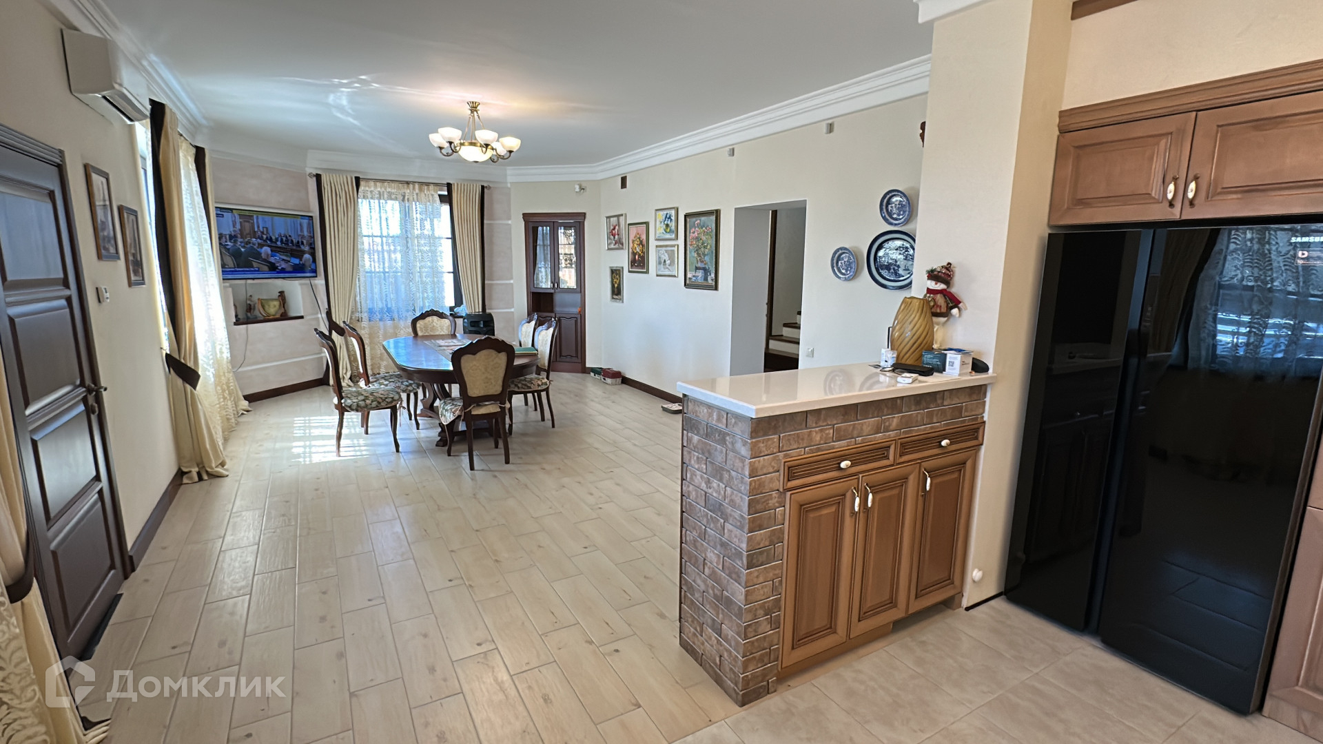 Кирпичный дом 210 м.кВ, на первом этаже: гостиная, кухня с обеденной зоной, с выходом на летнюю террасу, а также гардеробная, котельная и туалет.