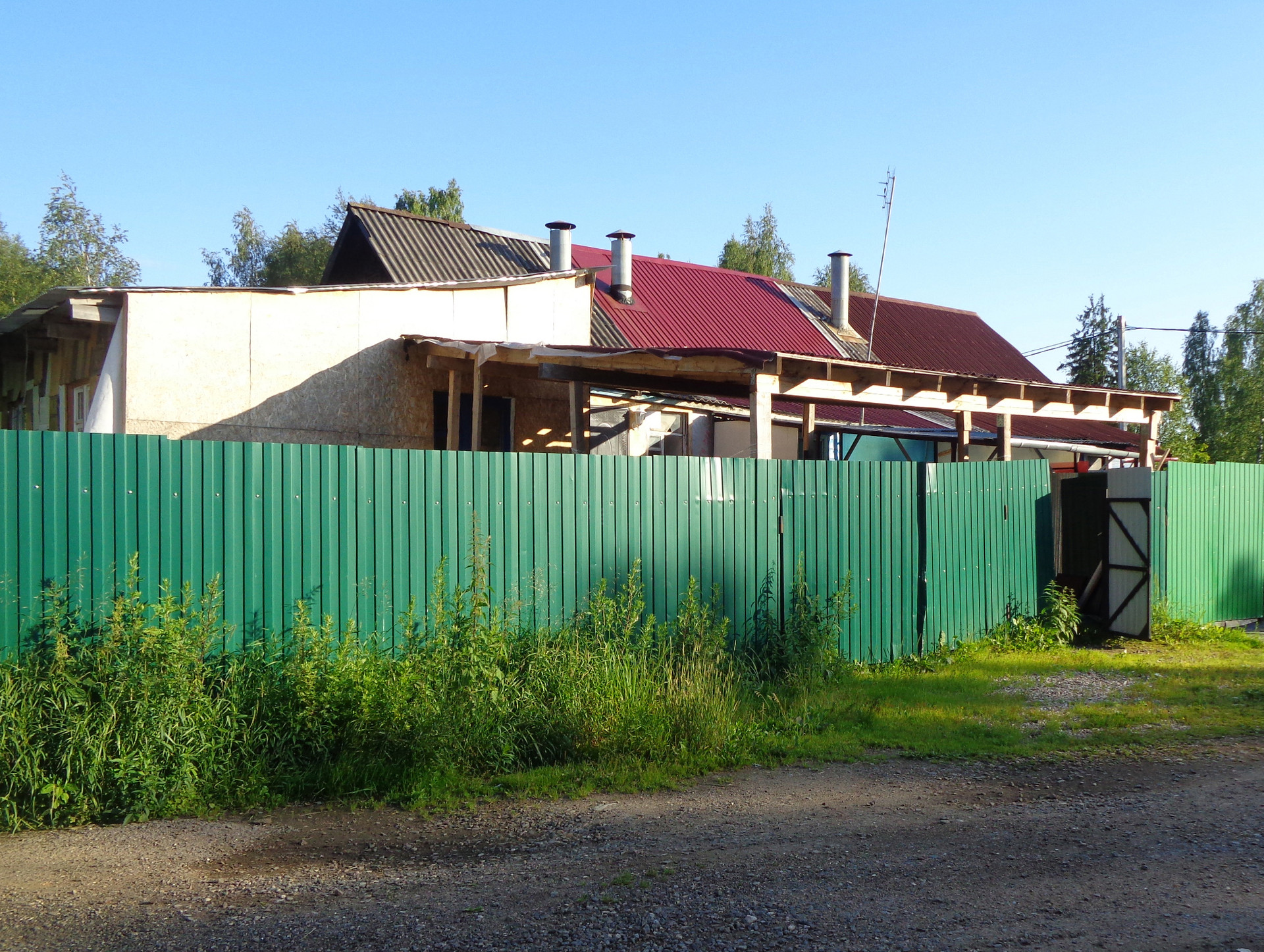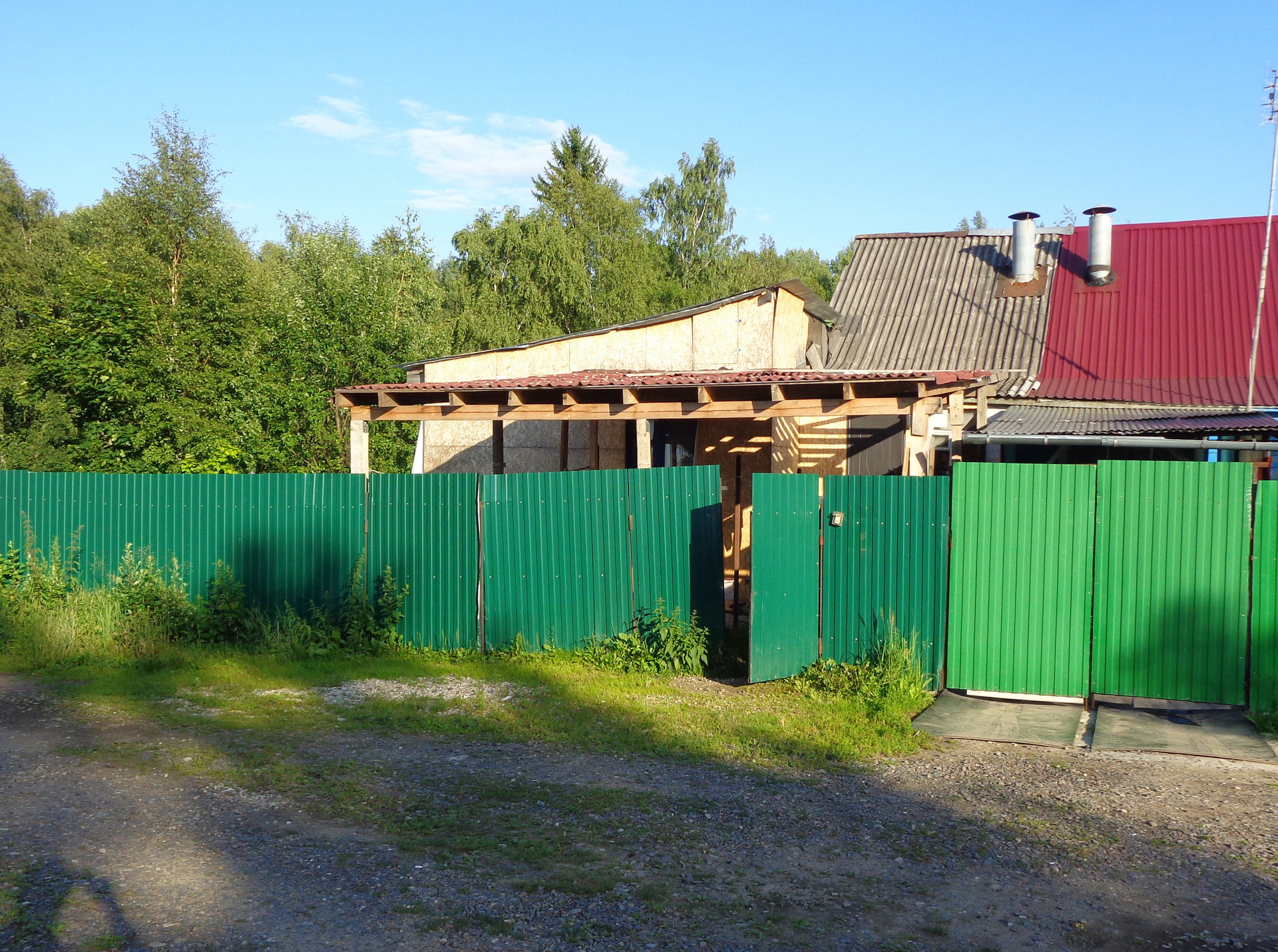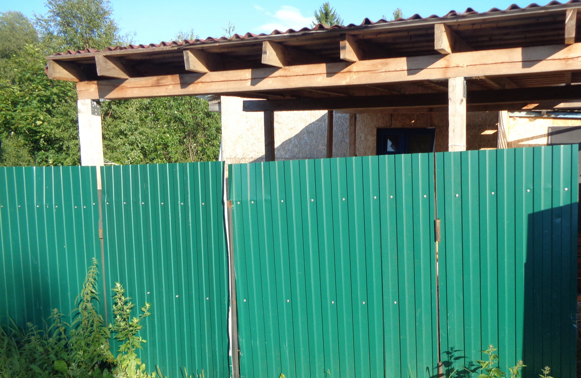 Забор новый из профнастила высокий на столбах цементированных  с воротами, на участке есть площадка под стоянку автомобиля,  крытая.