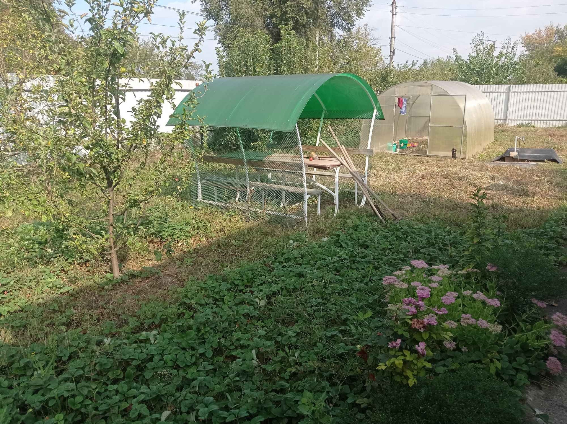 На участке гараж, летний душ, туалет, беседка, теплица, подвал.