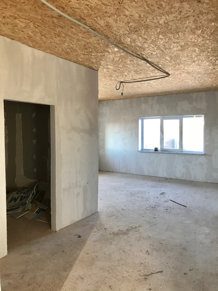 Все стены выровнены, потолки подшиты OSB, качественные пластик. окна, выполнена разводка по свету и электрике.