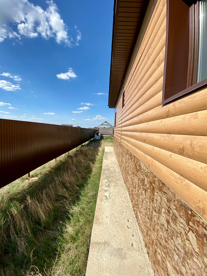Материал стен - брус + утеплитель + металлосайдинг, фундамент ленточный.