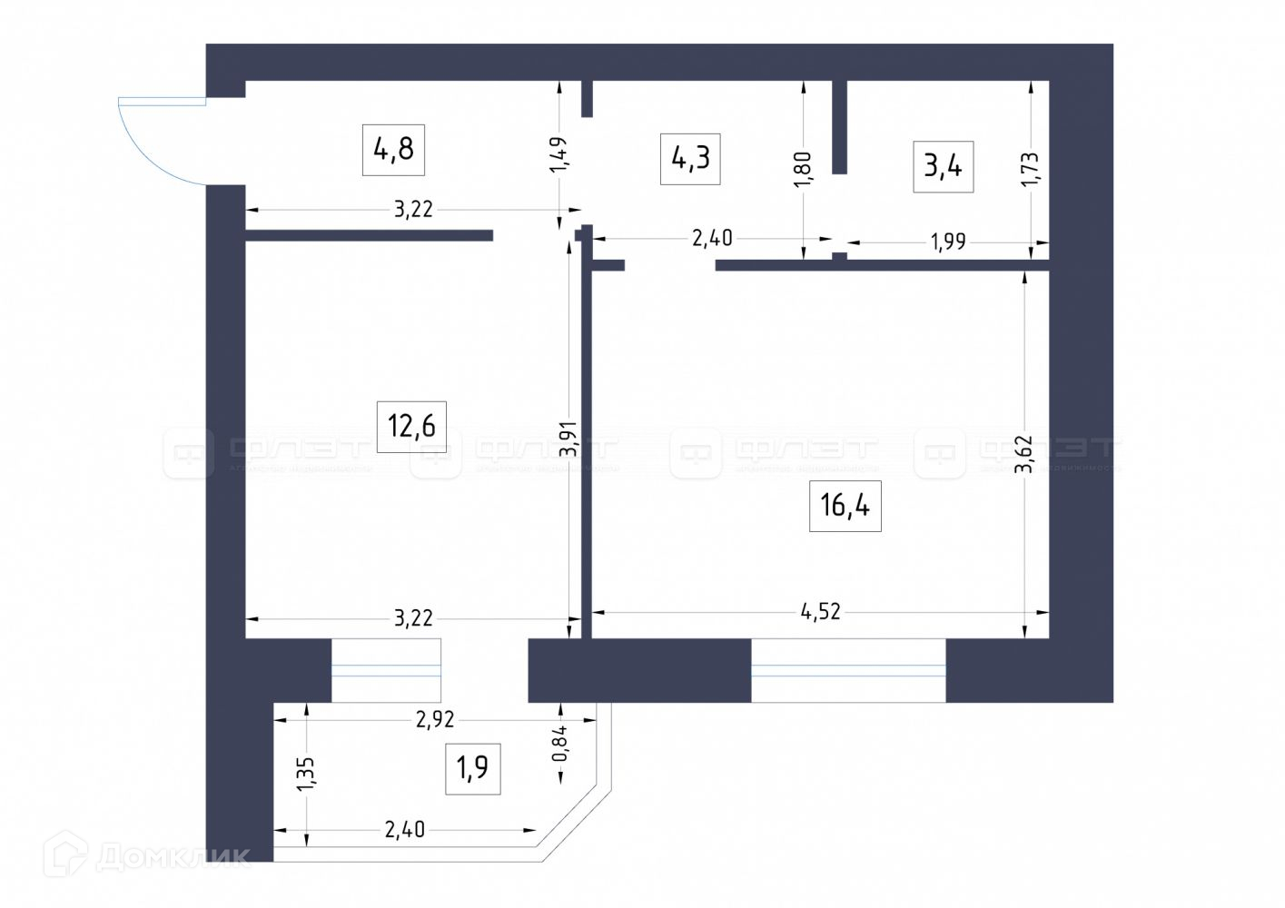 Жилая площадь 16.4 м2