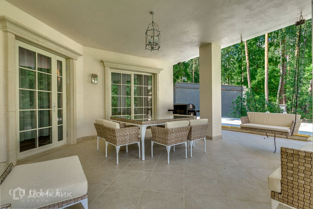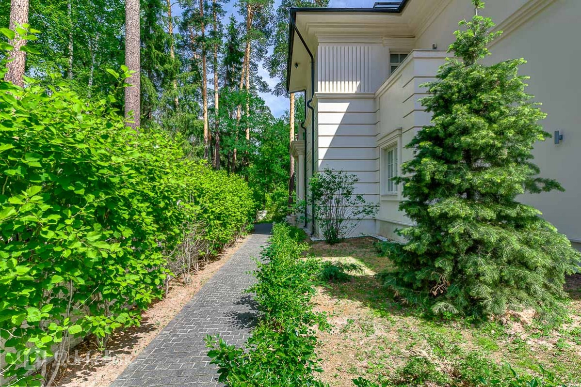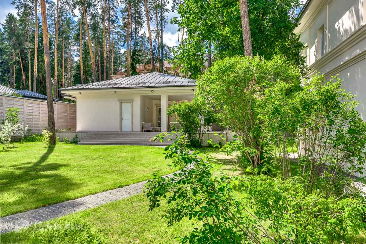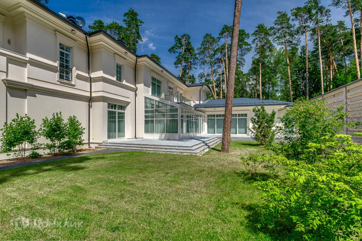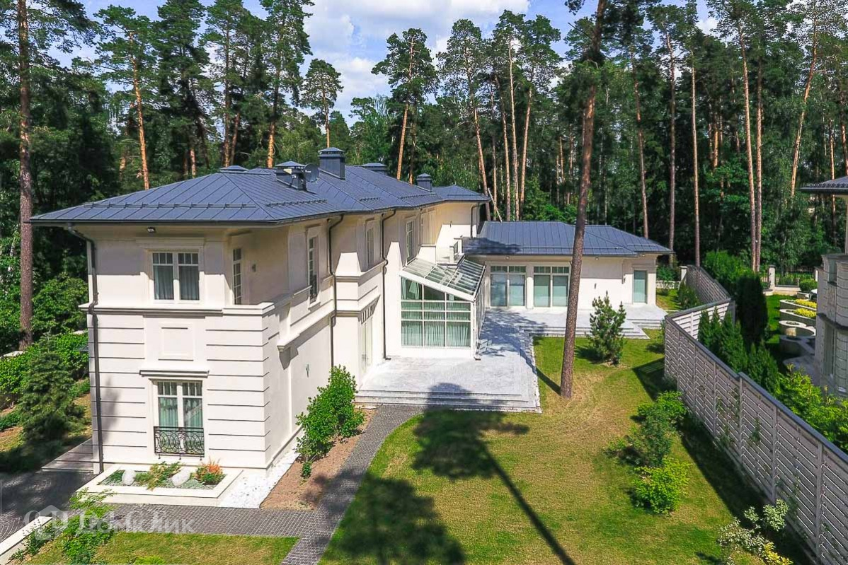 Просторный и светлый загородный дом находится в поселке «Жуковка-2», который расположен в 8 км от Москвы. Добраться до  резиденции можно по Рублево-Успенскому шоссе. Земельный участок  25 соток, а общая площадь коттеджа – 800 м2. Находится на лесном участке среди великолепных вековых сосен. Трехуровневый коттедж отличается следующими особенностями:на территории обустроен бассейн открытого типа и построен банный комплекс,