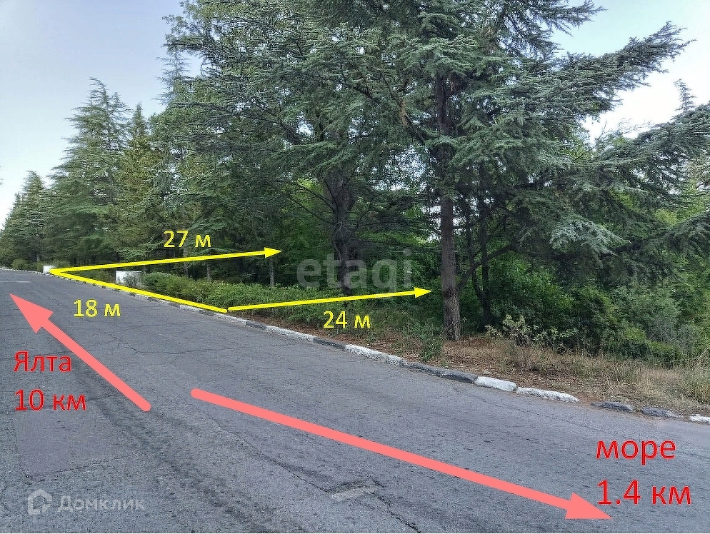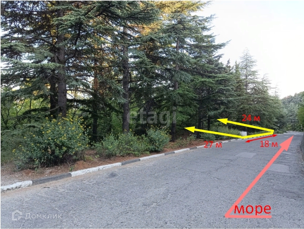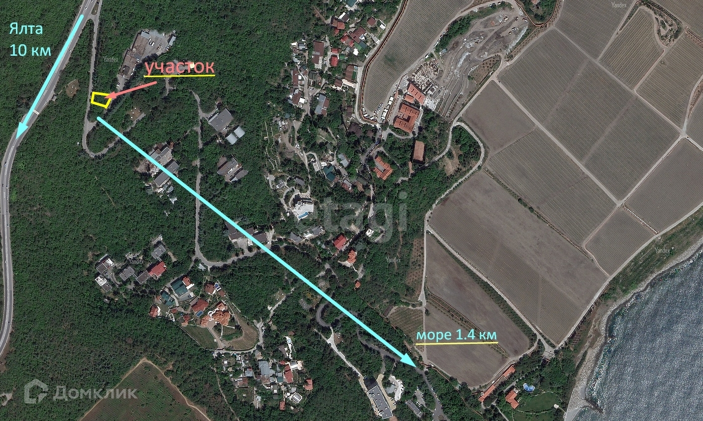 Площадь участка 5 соток. Имеет вид на Медведь-гору и море. Уклон небольшой. Рельеф ровный. Электричество, вода, водоотлив - по границе участка. На участке отсутствуют реликтовые деревья. Рядом расположены еще 3 участка по 5 соток. Возможно объединить.