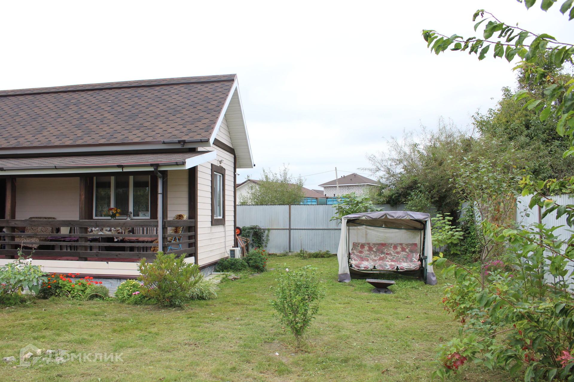 Рядом с домом устроена зона барбекю с романтической качелей.