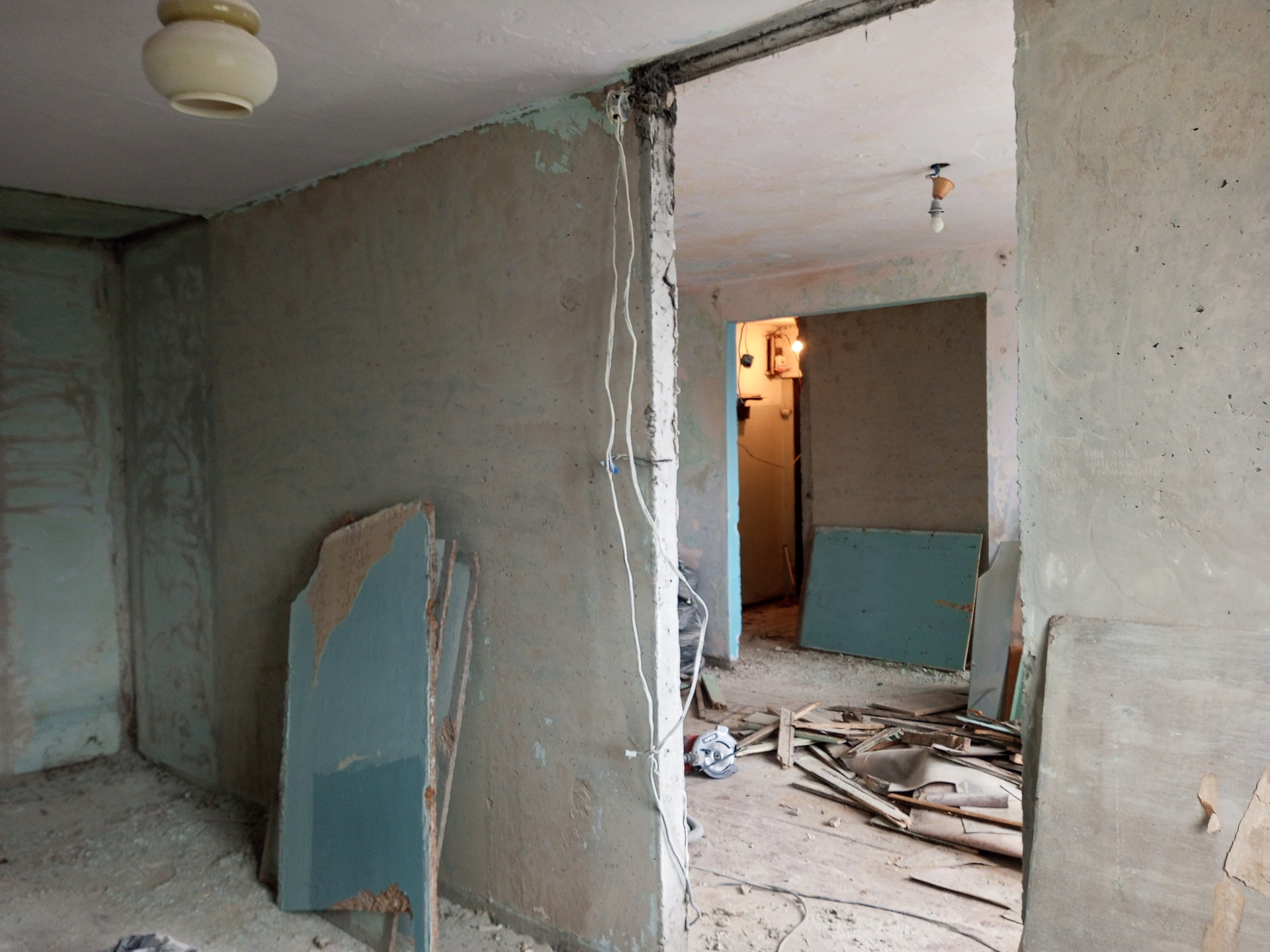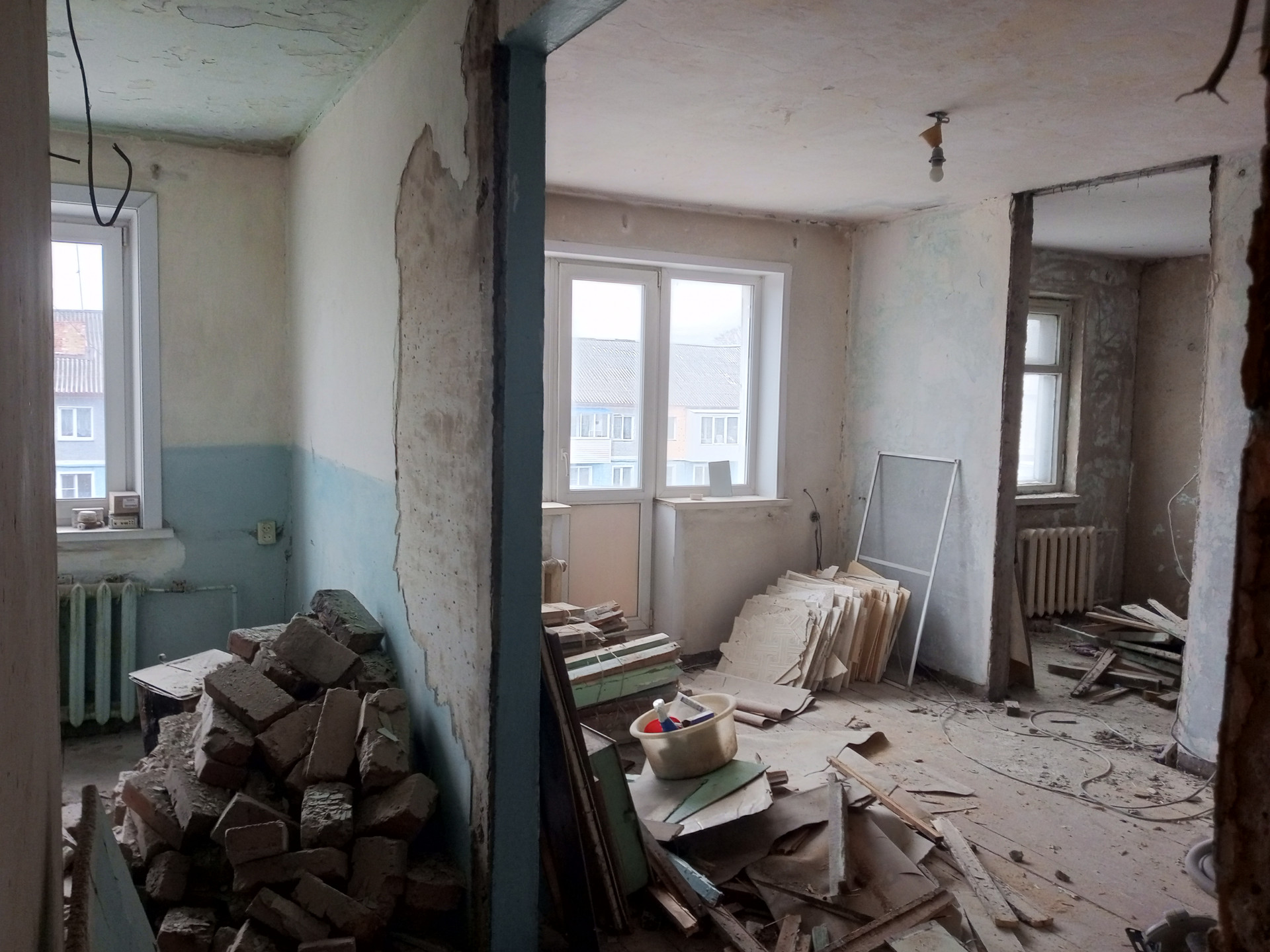 Квартира готовится к капитальному ремонту: демонтированы деревянные плинтусы, межкомнатные двери, разобрана деревянная гардеробная, разобрана печь, выровнены стены. Металлическая входная дверь, 2 пластиковых окна (третье окно  деревянное).