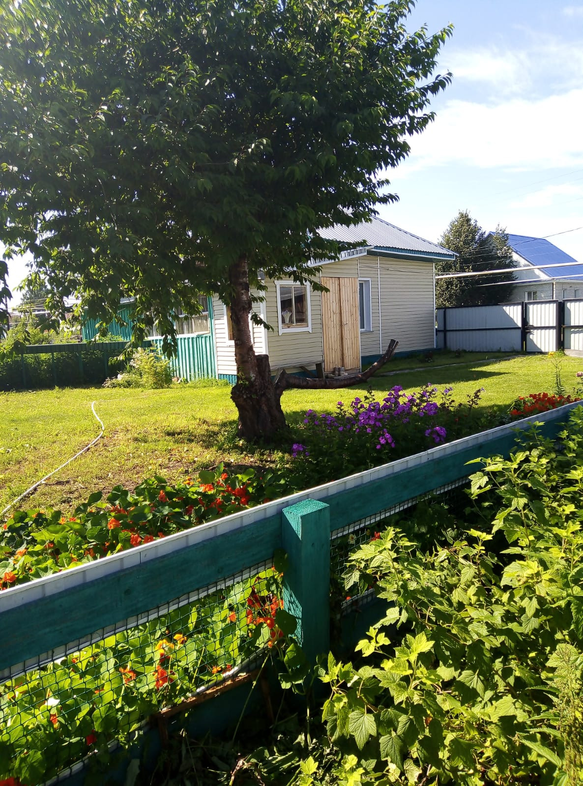 Сам участок ухоженный, разделен на зоны под огород, под картошку, и место с газоном для отдыха и зоной барбекю. Есть гараж и капитальные постройки для домашнего скота.