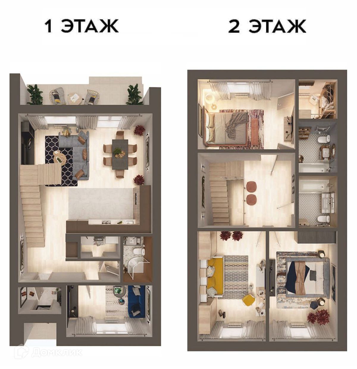 - четыре комнаты, расположенные на первом и втором этаже.