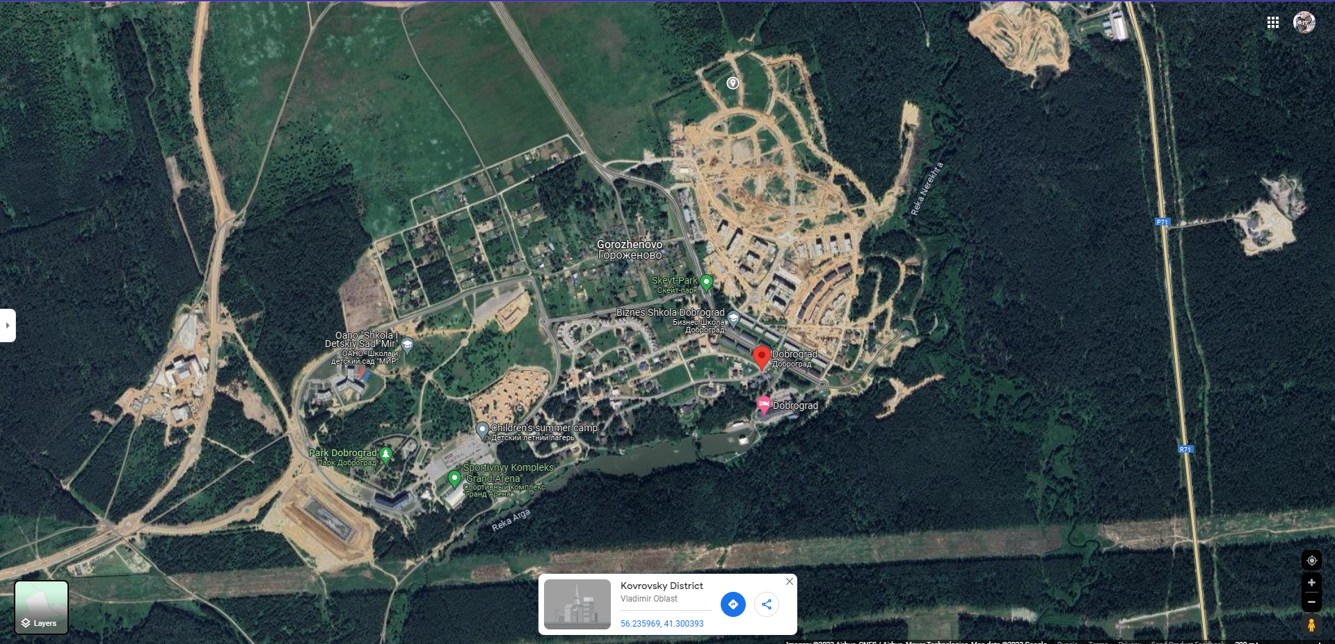 Очень удобное расположение участка позволяет добраться до центра Доброград всего за 5 минут. До г. Ковров дорога займет 20 минут. До г.Владимир 50-60мин.