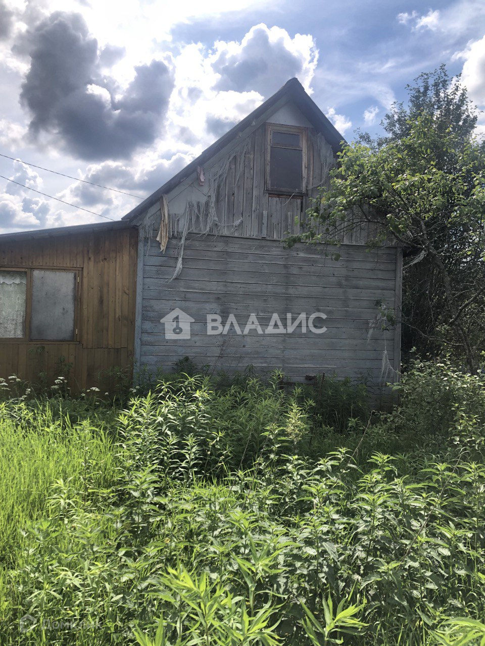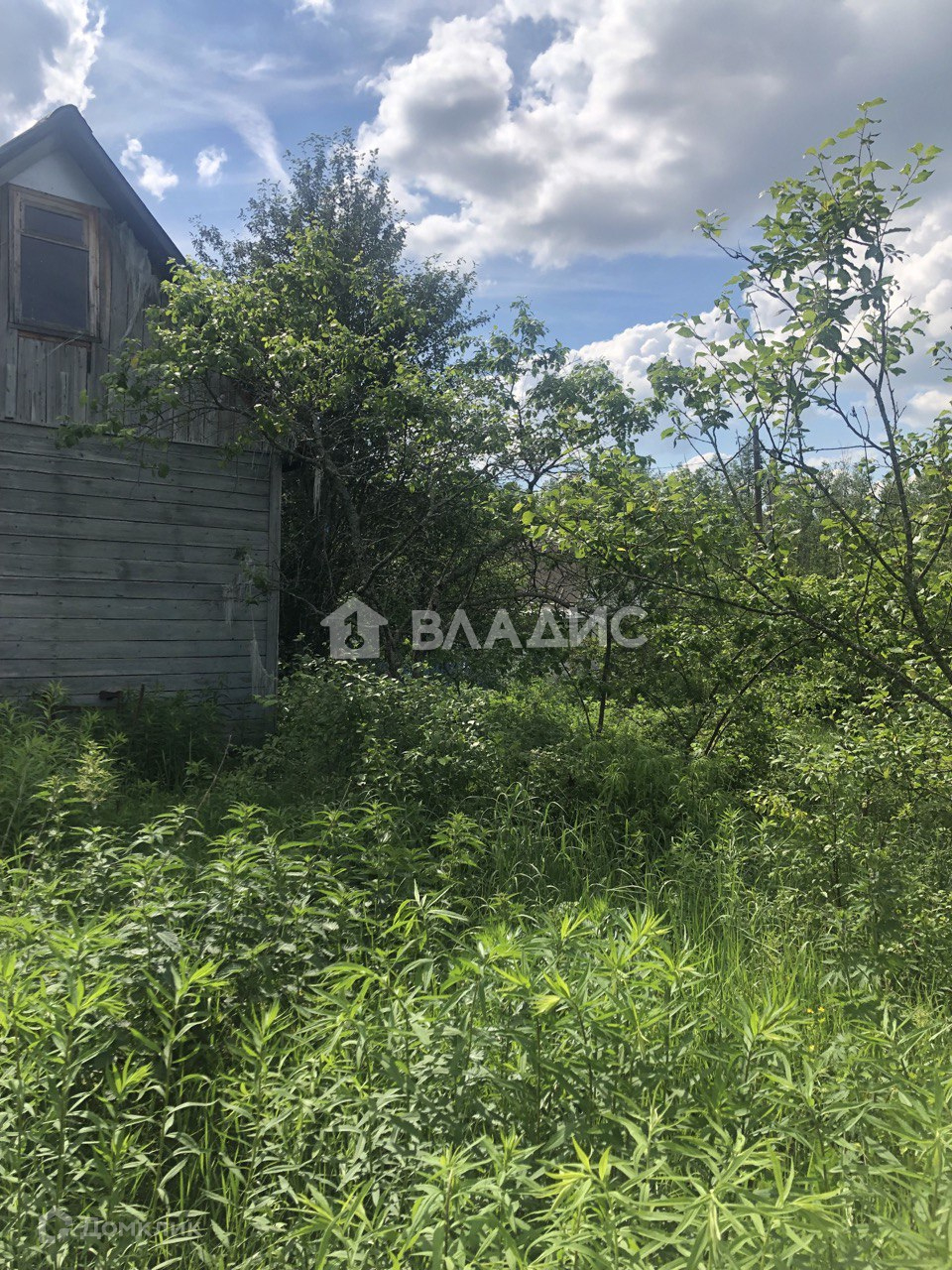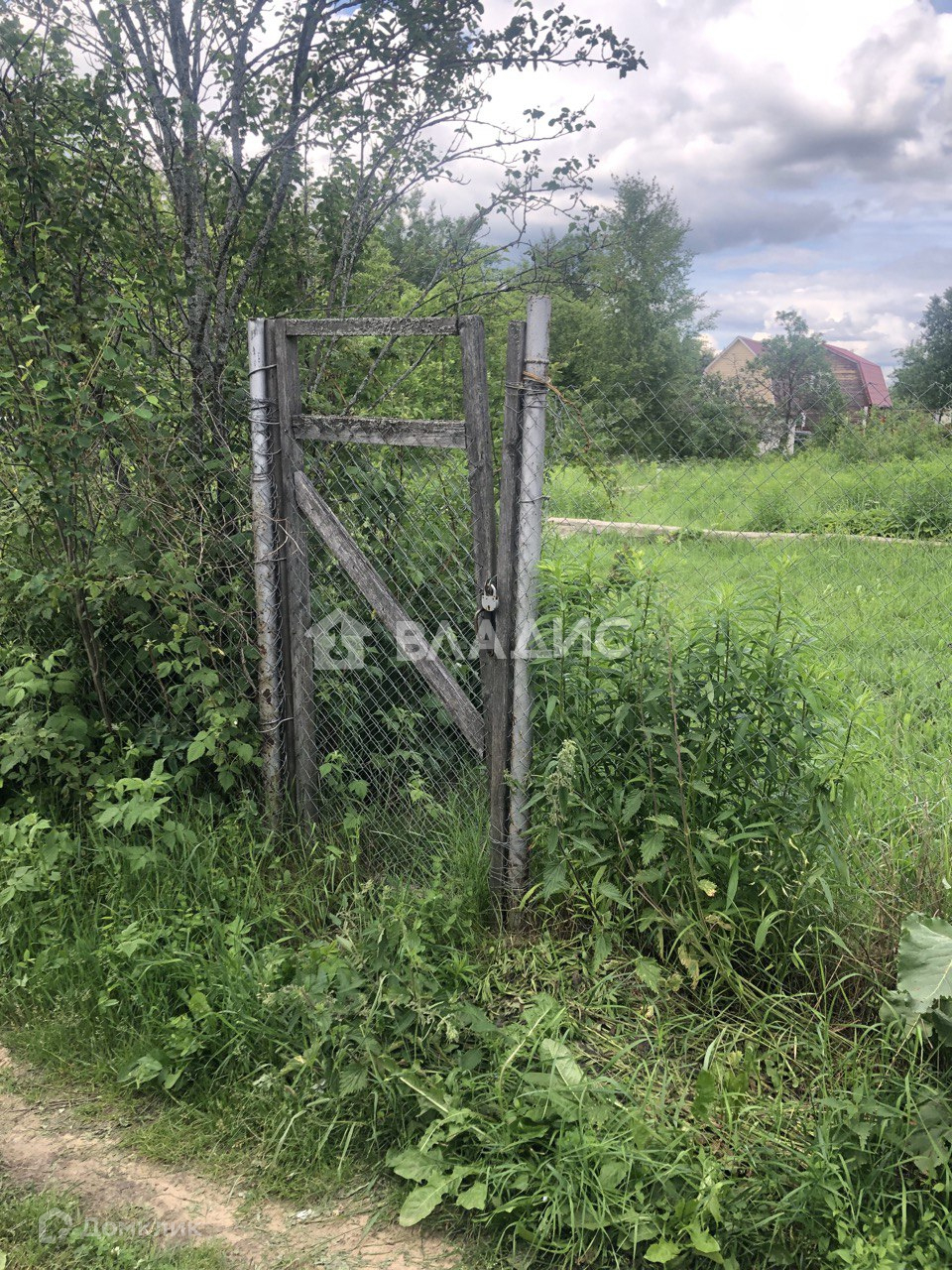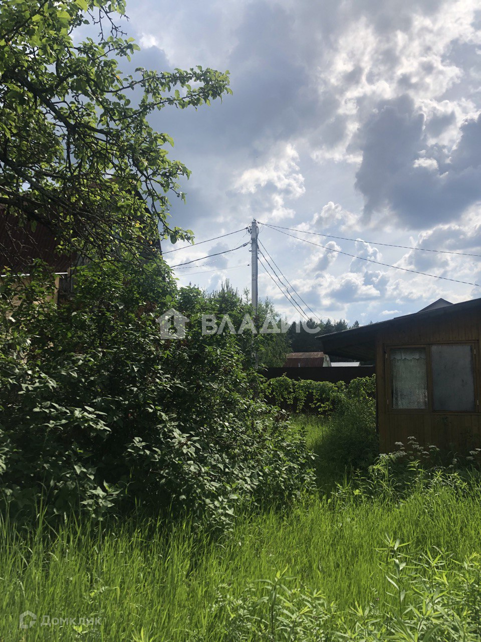 На участке дачный щитовой дом (ровный, крепкий, на фундаменте). Покрыт шифером. Сетка рабица по фасаду.