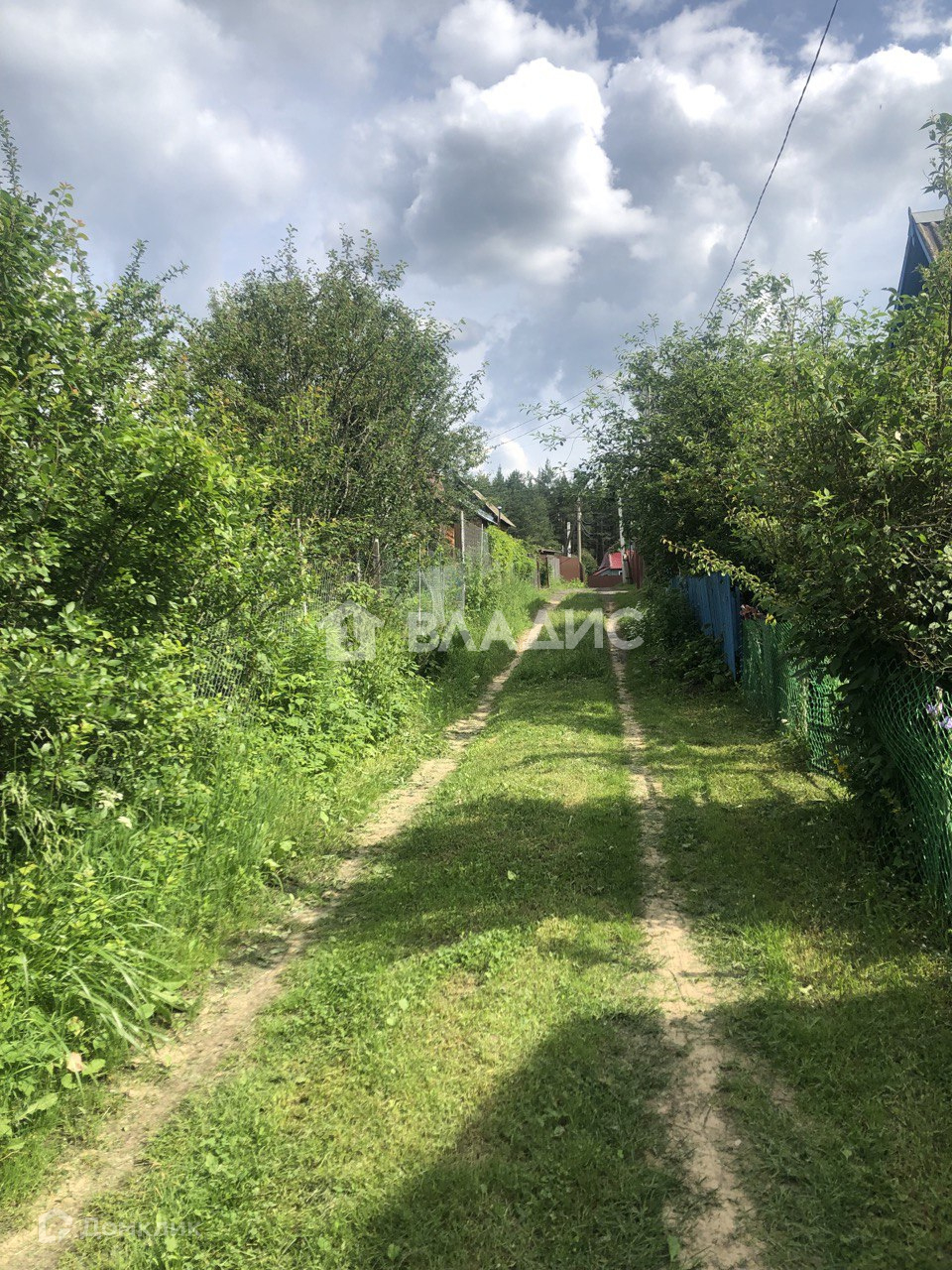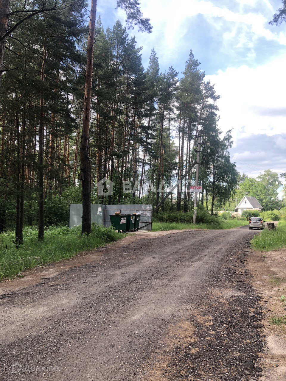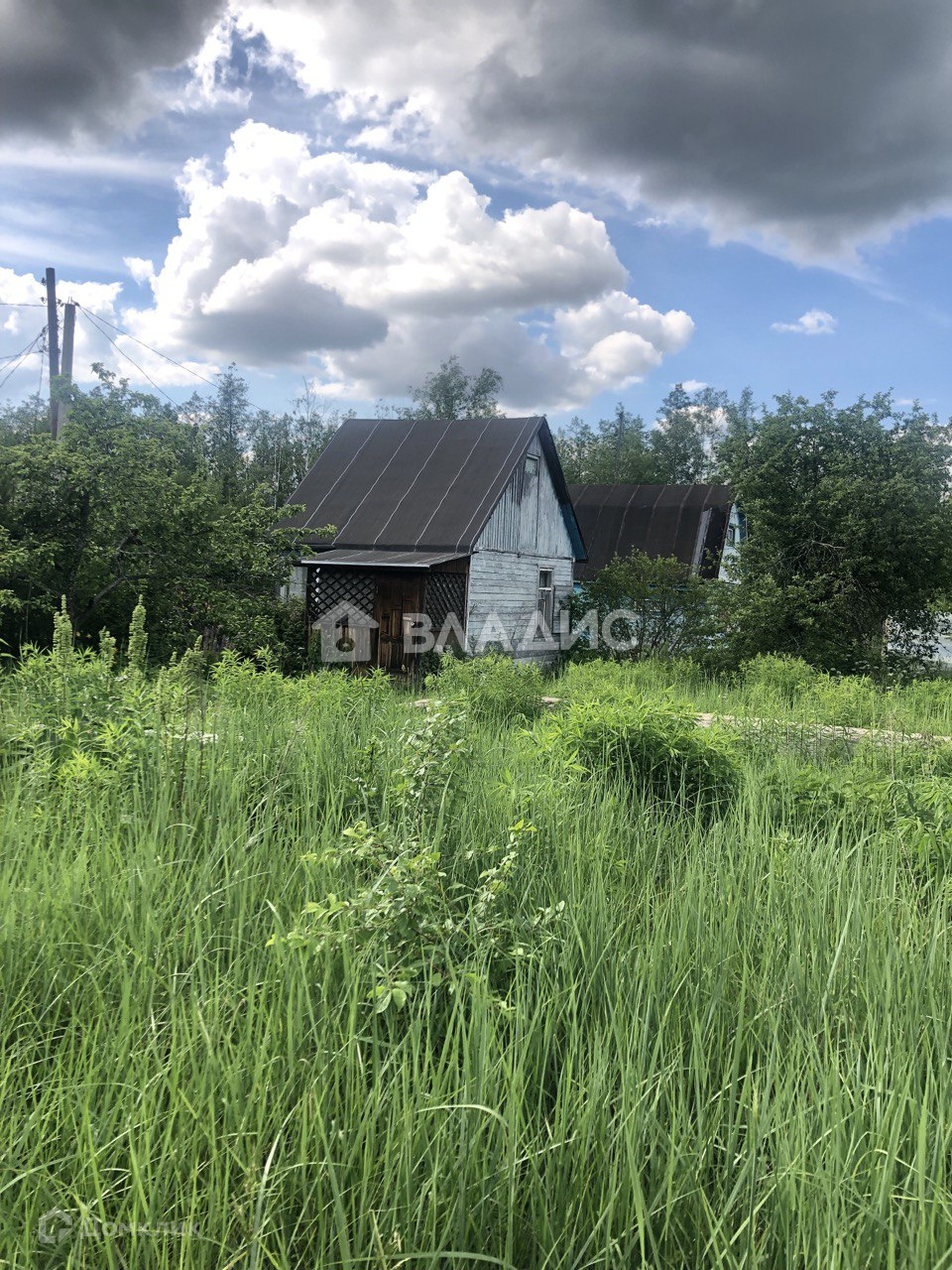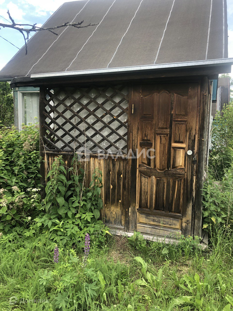На участке дачный щитовой дом (ровный, крепкий, на фундаменте). Покрыт рубероидом. Летний туалет, хозблок и высокий металлический каркас для летнего душа.Сетка рабица по фасаду.