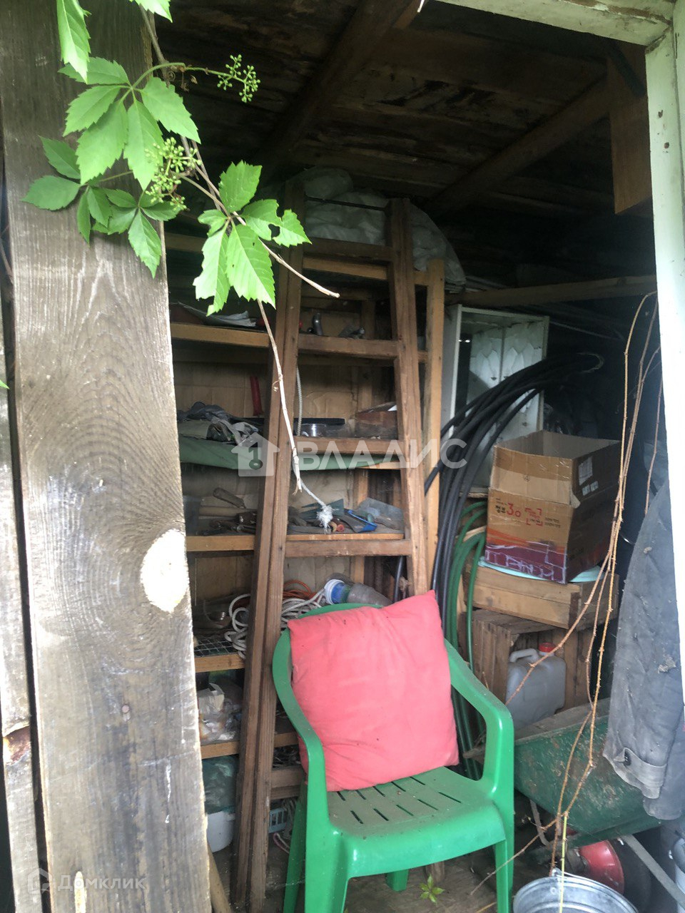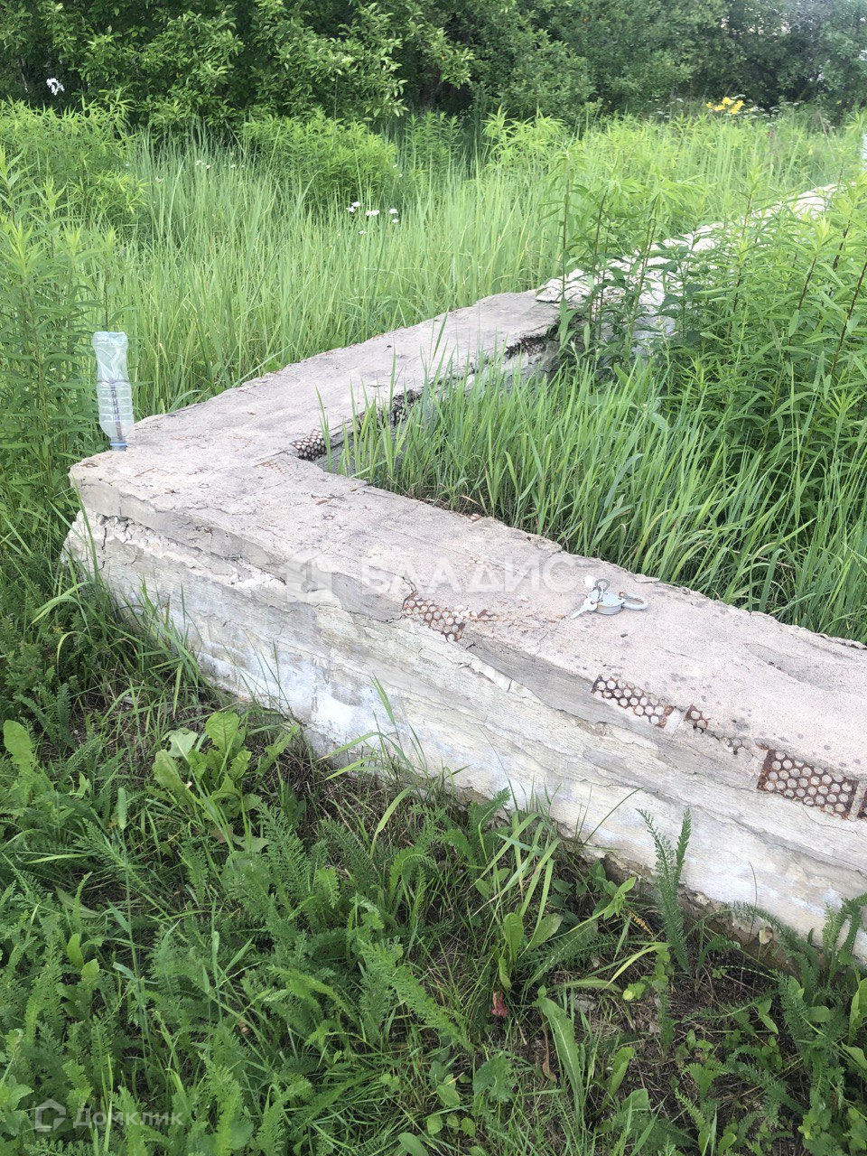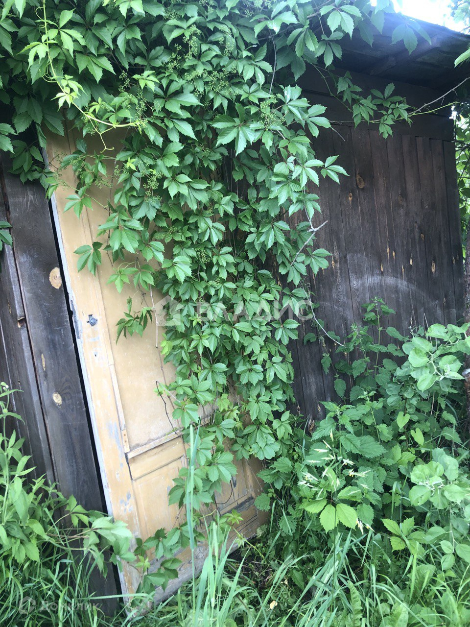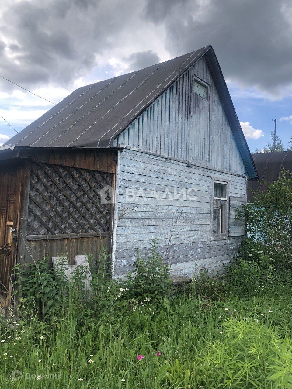 На участке дачный щитовой дом (ровный, крепкий, на фундаменте). Покрыт рубероидом. Летний туалет, хозблок и высокий металлический каркас для летнего душа.Сетка рабица по фасаду.