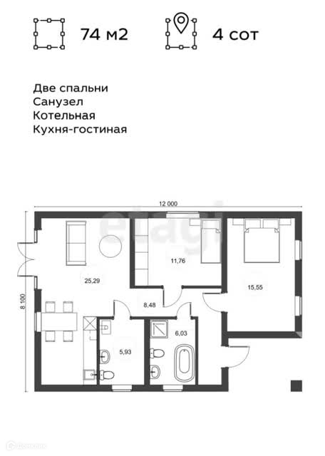 На участке 4 сотки располагается дом 74 кв.м. (из блока ГРАС 300мм с перегородками из силикатного кирпича).
