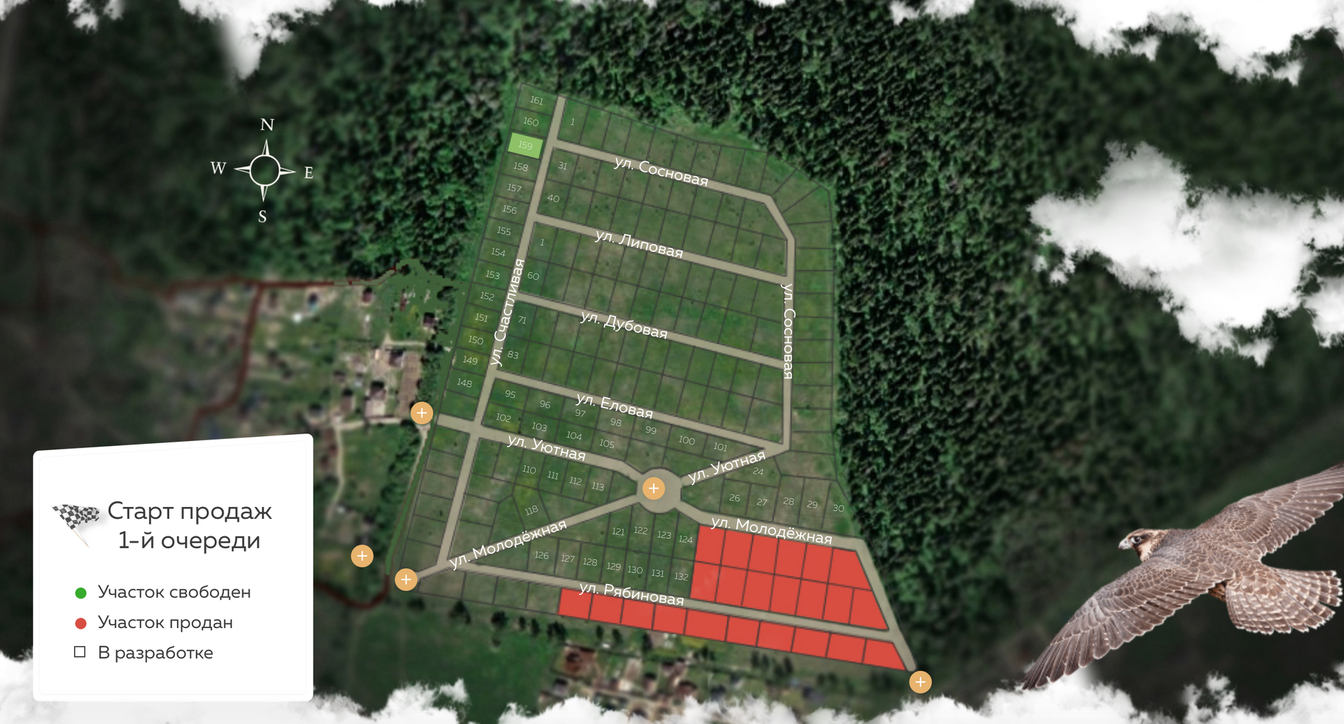 На июнь 2022 года выполнена расчистка и разметка территории, ведётся разработка грунта. Продано 17 участков.